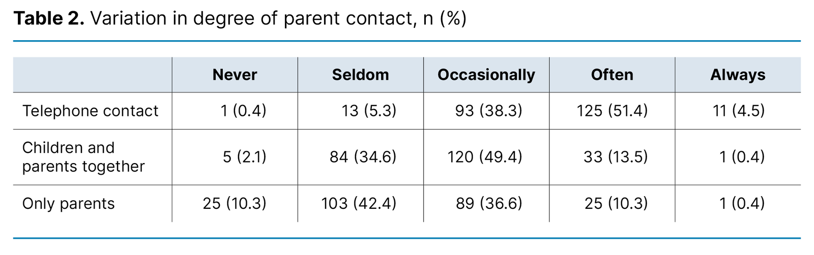 The relatively high degree of parent contact may be due to the increased focus on mental health and family-centred work in recent years. (1, 8).