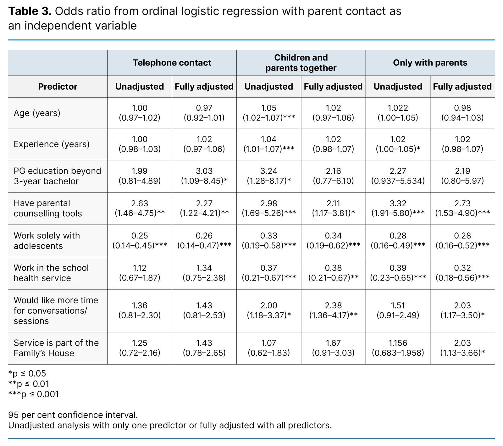 The results show that nurses who worked solely with adolescents reported having parent contact to a far smaller extent than the rest of the sample (Tables 3 and 4).