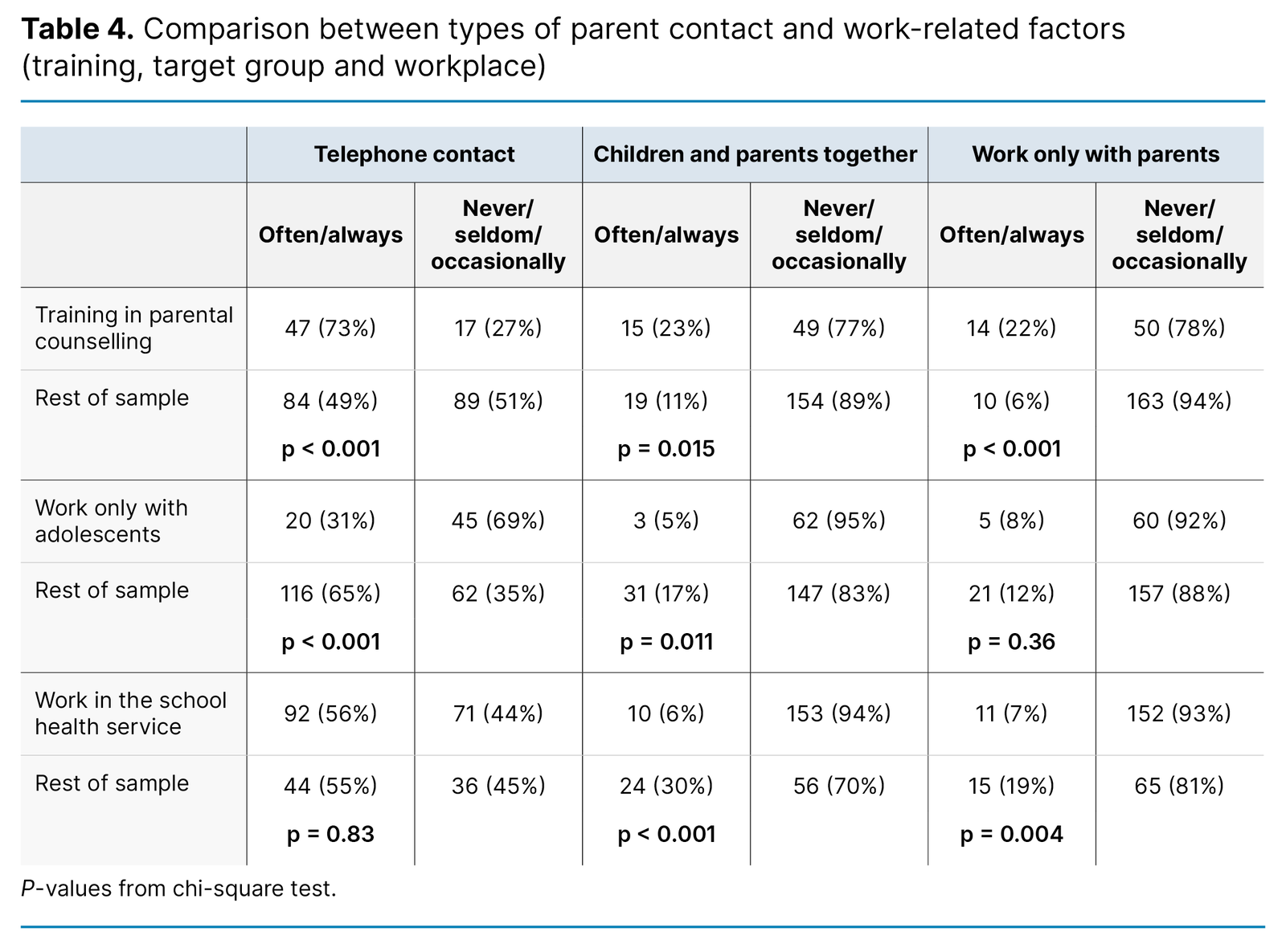 Table 4. Comparison between types of parent contact and work-related factors (training, target group and workplace)