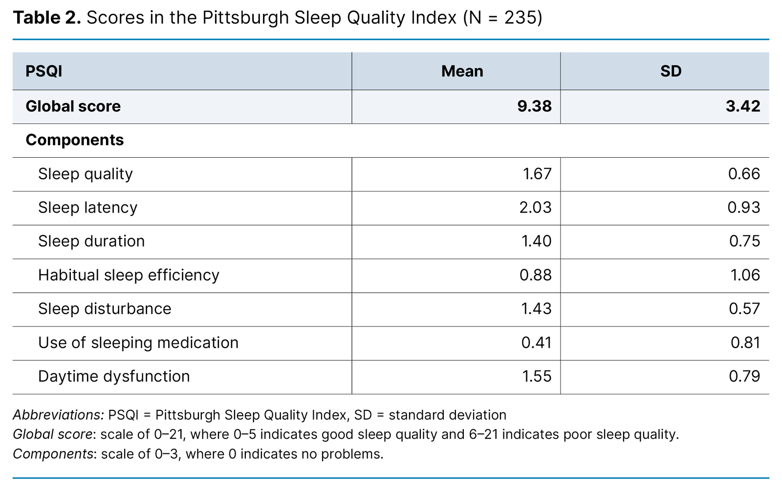 Table 2 presents the PSQI scores in the sample. The average PSQI score was 9.38 (SD 3.42, range 3–19). The mean scores for the PSQI components varied from 0.41 to 2.03. Among the components, sleep latency (mean 2.03, SD 0.93) had the highest score, indicating that many participants experienced long sleep onset times.