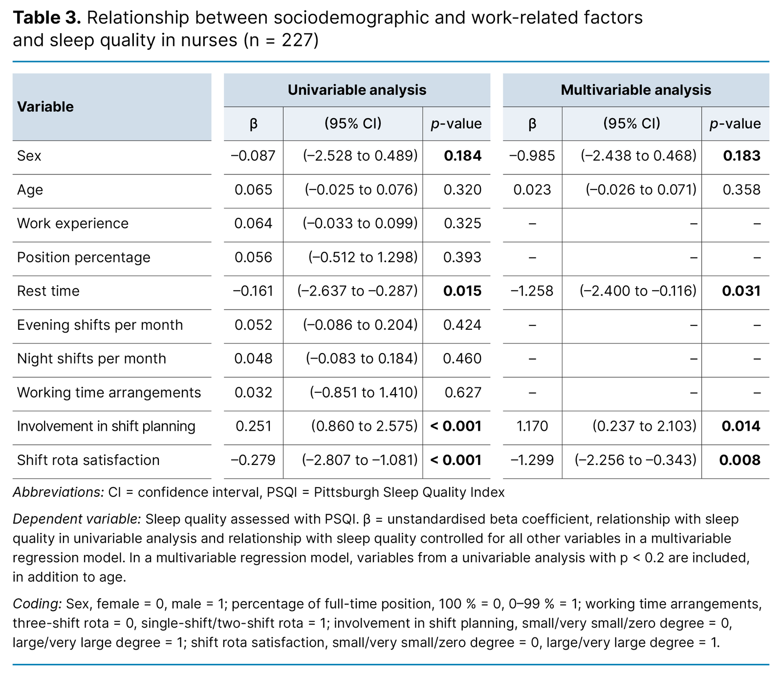 In the linear regression model examining the relationship between sociodemographic and work-related factors and sleep quality, a complete dataset was available for analysis for 96.6% of participants (227/235) (Table 3). Following the univariable analysis, sex, rest period, involvement in shift planning and shift rota satisfaction were included in the multivariable analysis. In the multivariable analysis, rest period, involvement in shift planning and shift rota satisfaction were associated with sleep quality (p < 0.050): for each additional hour of rest time, the PSQI score decreased by –1.26 (confidence interval [CI]: –2.4 to –0.1, p = 0.031).
