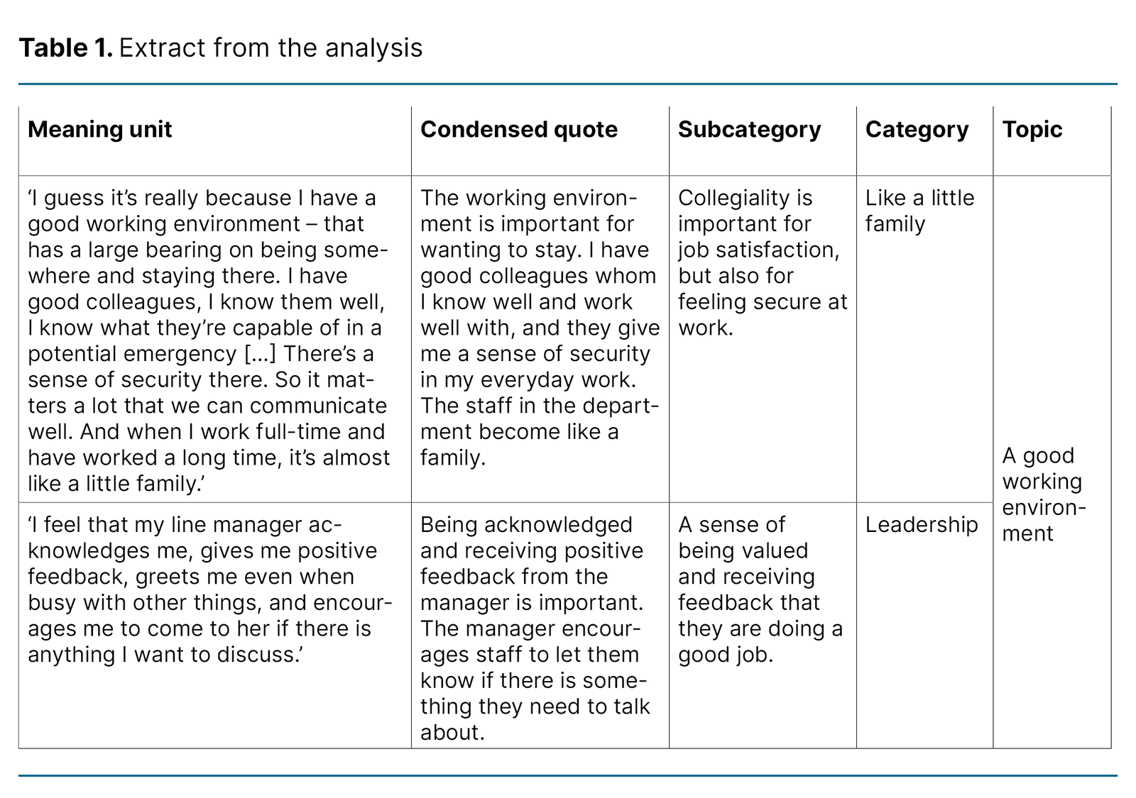 Earlier research shows that a good working environment has a significant impact on job satisfaction (14, 20). One study found that colleagues working with critically ill patients experienced a greater degree of peer support than those in departments with less seriously ill patients (20). The participants described the same phenomenon as in our study: colleagues become like a family.