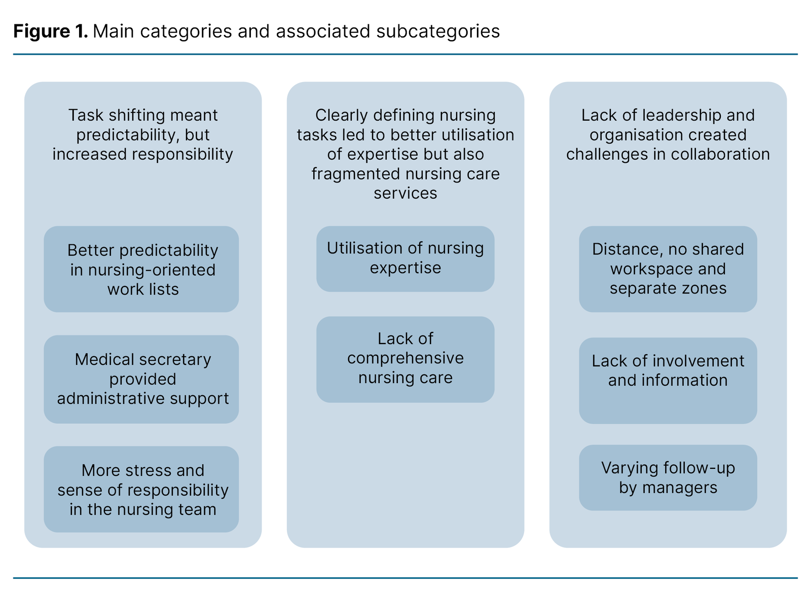 We identified three main themes: 1) Task shifting meant predictability, but increased responsibility, 2) Clearly defining nursing tasks led to better utilisation of expertise but also fragmented nursing care services, and 3) Lack of leadership and organisation created challenges in collaboration. Figure 1 illustrates the main categories and corresponding subcategories.