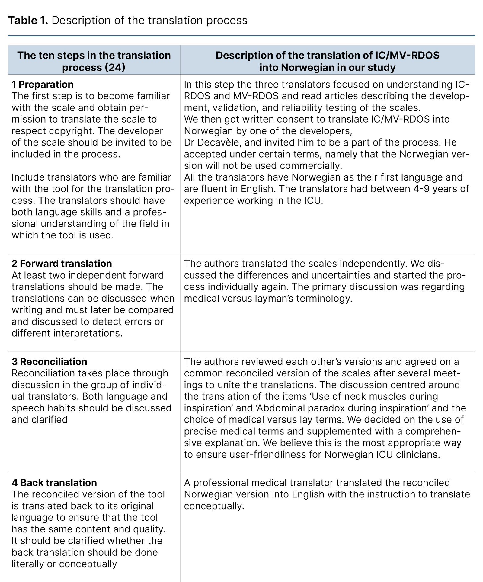 Furthermore, it is standard practice in Norway not to translate the name or abbreviation of scales used in the ICU. The translated versions of the IC-RDOS and MV-RDOS are presented in Figure 1. The back-translated version was accepted by the developer of the scales without disagreement.