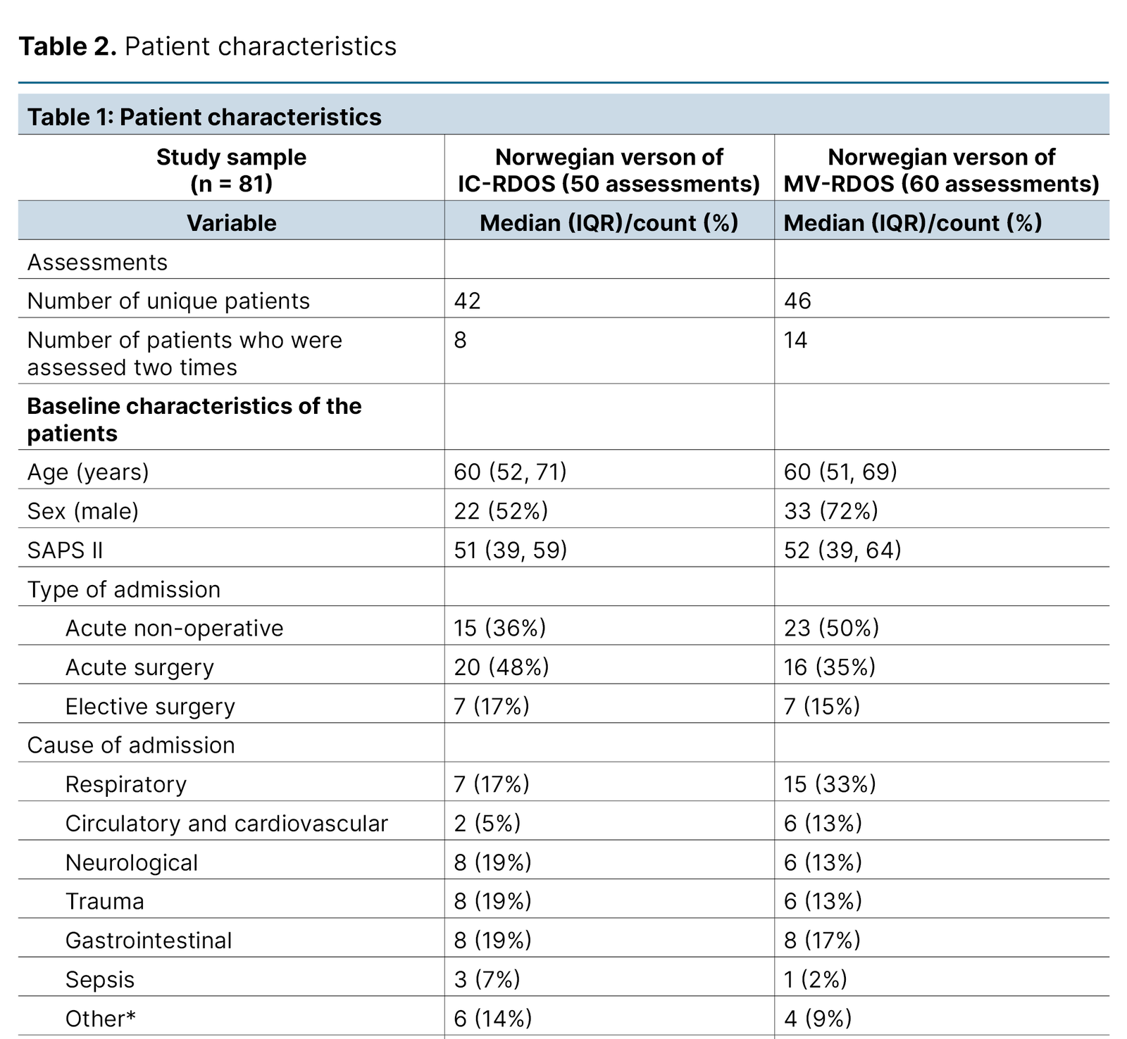 In addition, out of the 60 assessments performed on mechanically ventilated patients, only 4 (7%) used NIV. As a result of this we cannot say the Norwegian version of the scale has been fully tested on patients receiving NIV. A final consideration is that the assessments were done on median day 6 and 10 in the ICU for IC-RDOS and MV-RDOS respectively. This differs from our ICUs in general with a median length of stay of 3 days, indicating that the instruments have been tested in patients with a prolonged ICU length of stay (1).