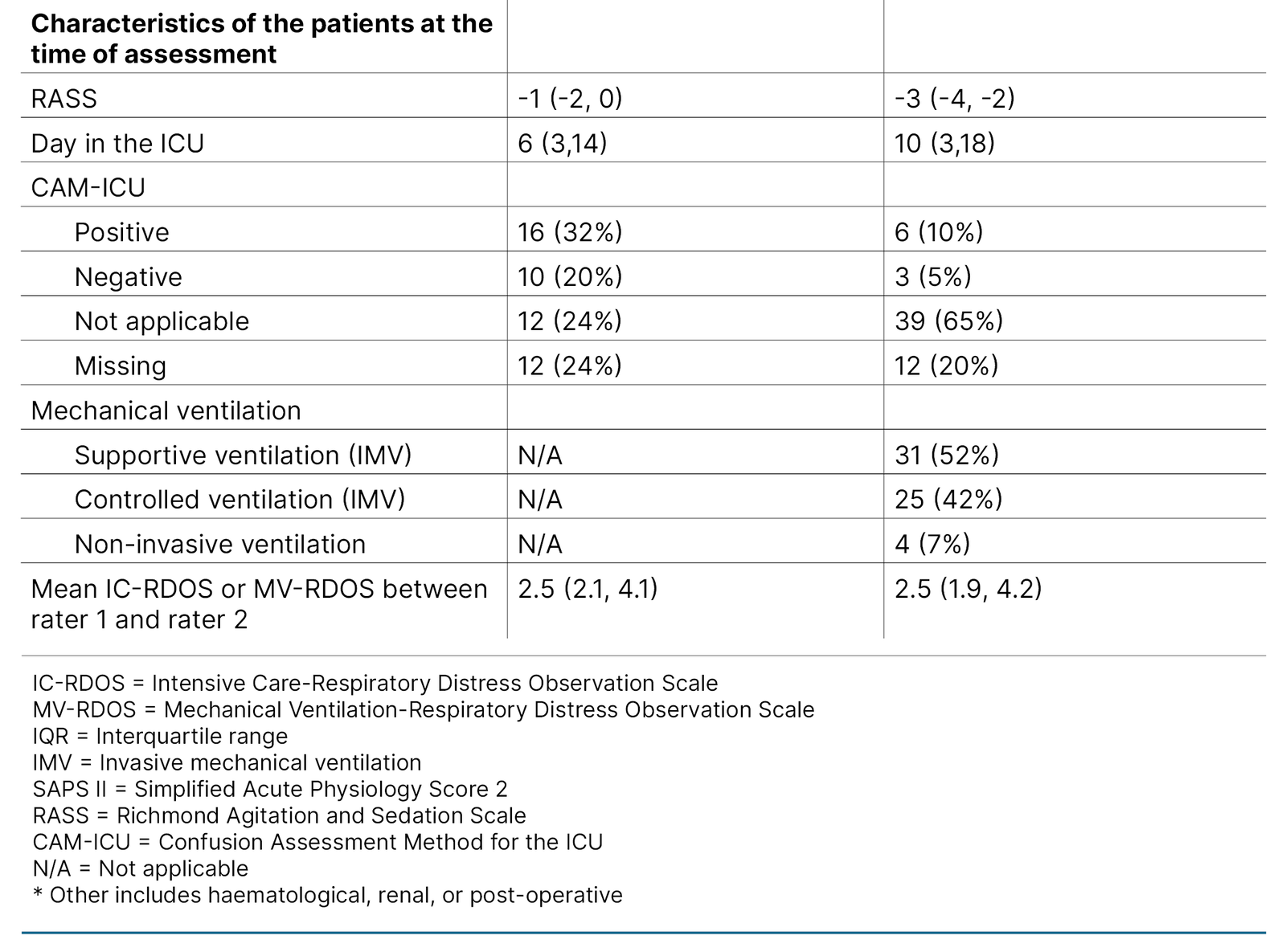 We performed 50 and 60 pairs of assessments for IC-RDOS and MV-RDOS, respectively. The median RASS at the time of the assessment was −1 (IQR −2, 0) for the non-mechanically ventilated patients and −3 (IQR −4, −2) for the mechanically ventilated patients, indicating drowsy and moderately sedated, respectively. The patient characteristics are summarised in Table 2.