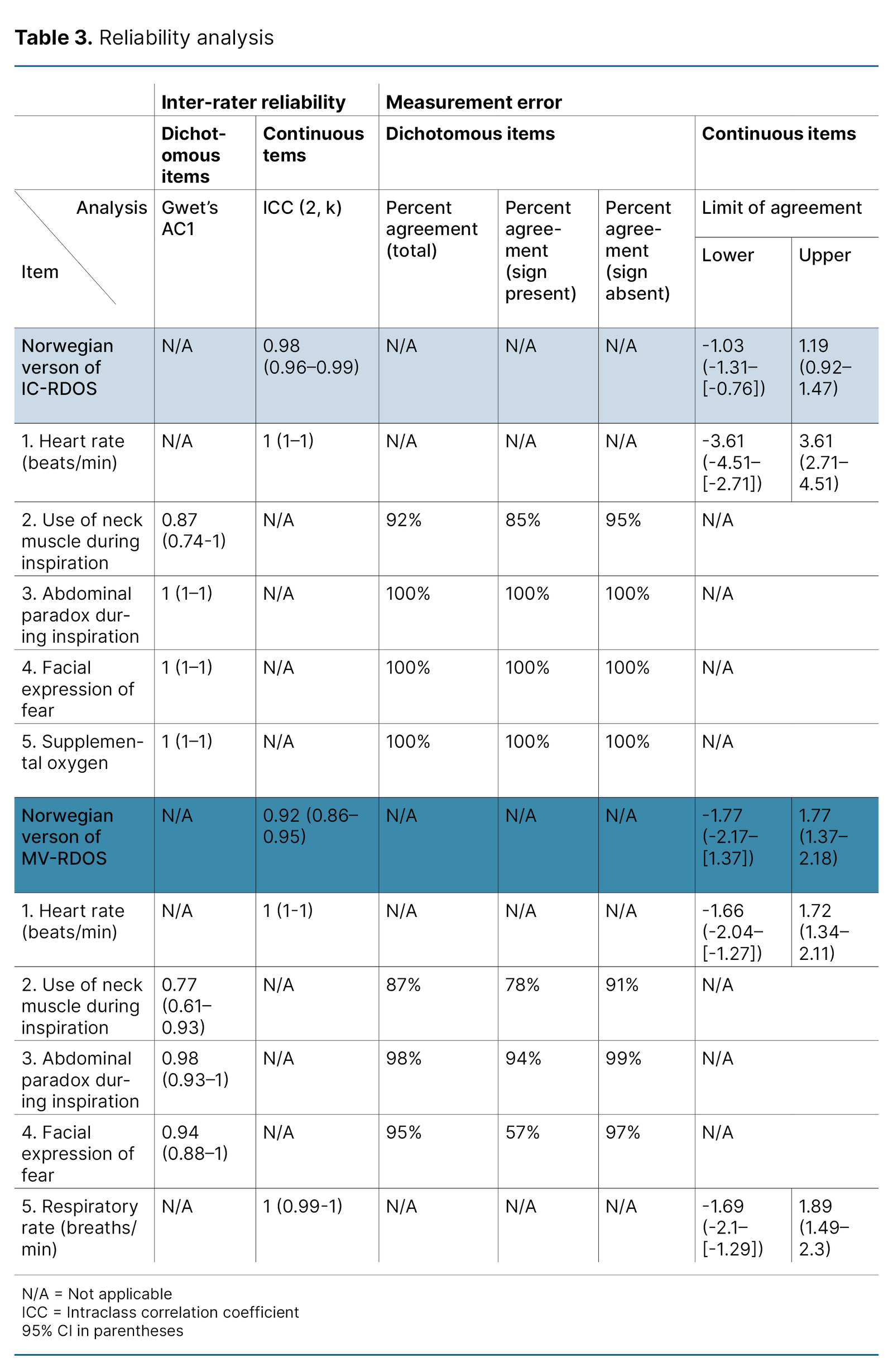 Method: We applied a prospective observational design to evaluate the inter-rater reliability and measurement errors of IC-RDOS and MV-RDOS. The translation process focused on linguistic and cultural adaption following international guidelines. Data for the inter-rater reliability analysis were collected in four ICUs in Norway. Two ICU nurses performed 110 assessments, and inter-rater reliability was evaluated using the intraclass correlation coefficient (ICC) for the total score and continuous items, while Gwet’s agreement coefficient 1 was applied for the dichotomous items.