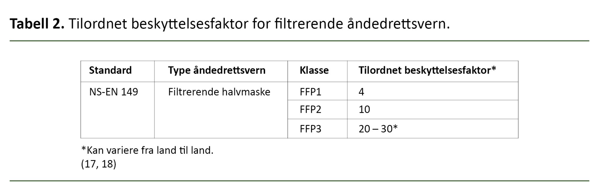 Tilordnet beskyttelsesfaktor for filtrerende åndedrettsvern er som vist i tabell 2.