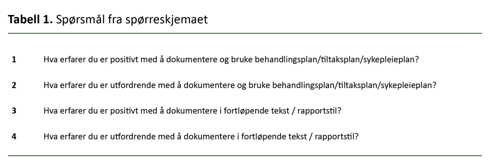 Med utgangspunkt i de utfordringene vi har nevnt her, ønsket vi mer kunnskap om hva sykepleierstudenter erfarer med å dokumentere sykepleie i praksisstudiene, både med standardterminologi i veiledende planer og med fritekst.