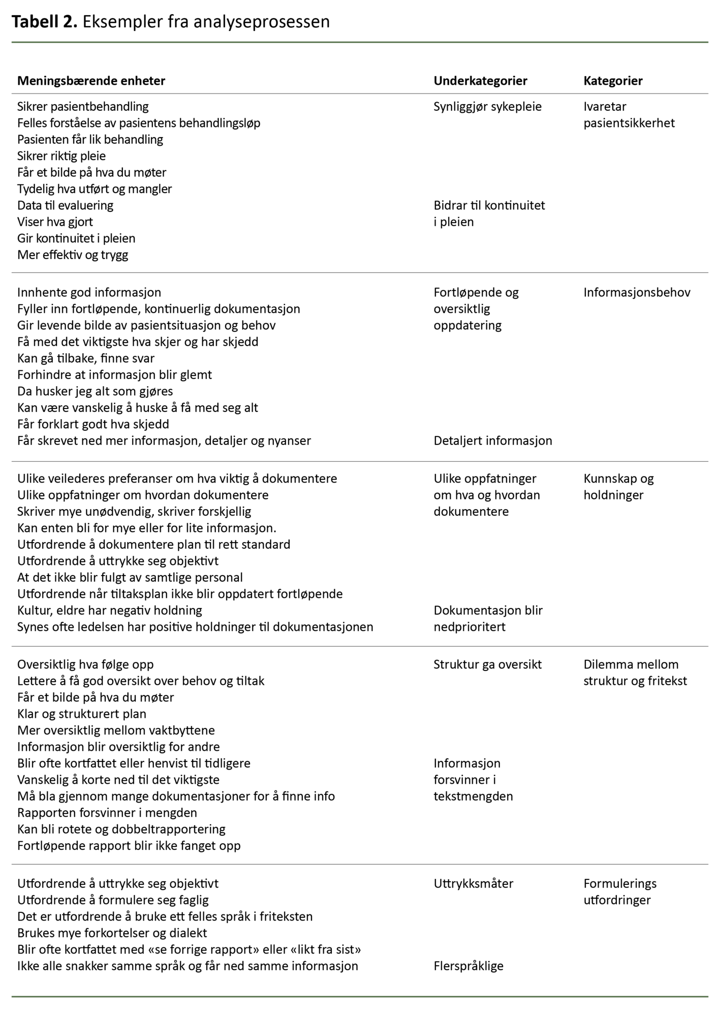 Førsteforfatteren validerte analyseprosessen og temaer som kom frem i resultatene, med andreforfatteren, slik at vi oppnådde enighet om kategoriene. Eksempler fra analyseprosessen er vist i tabell 2.
