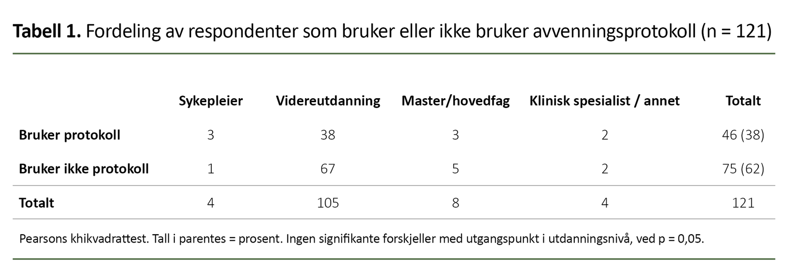 Tabell 1 viser fordelingen av antallet respondenter som svarte at de henholdsvis bruker eller ikke bruker avvenningsprotokoll.
