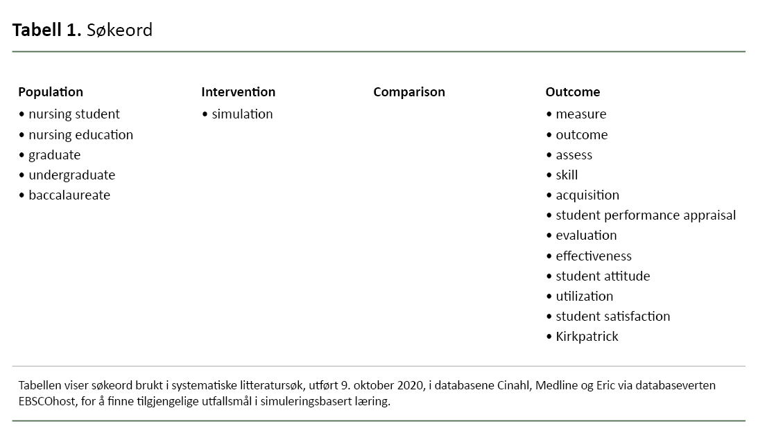 For å undersøke nærmere hva som finnes av tilgjengelige utfallsmål på simuleringsbasert læring brukt i bachelorutdanning i sykepleie, ble det i samarbeid med en erfaren bibliotekar utført et systematisk litteratursøk den 9. oktober 2020 i databasene Cinahl, Medline og Eric via databaseverten EBSCOhost. Det ble laget en søkestreng som inneholdt søkeordene som vist i tabell 1.