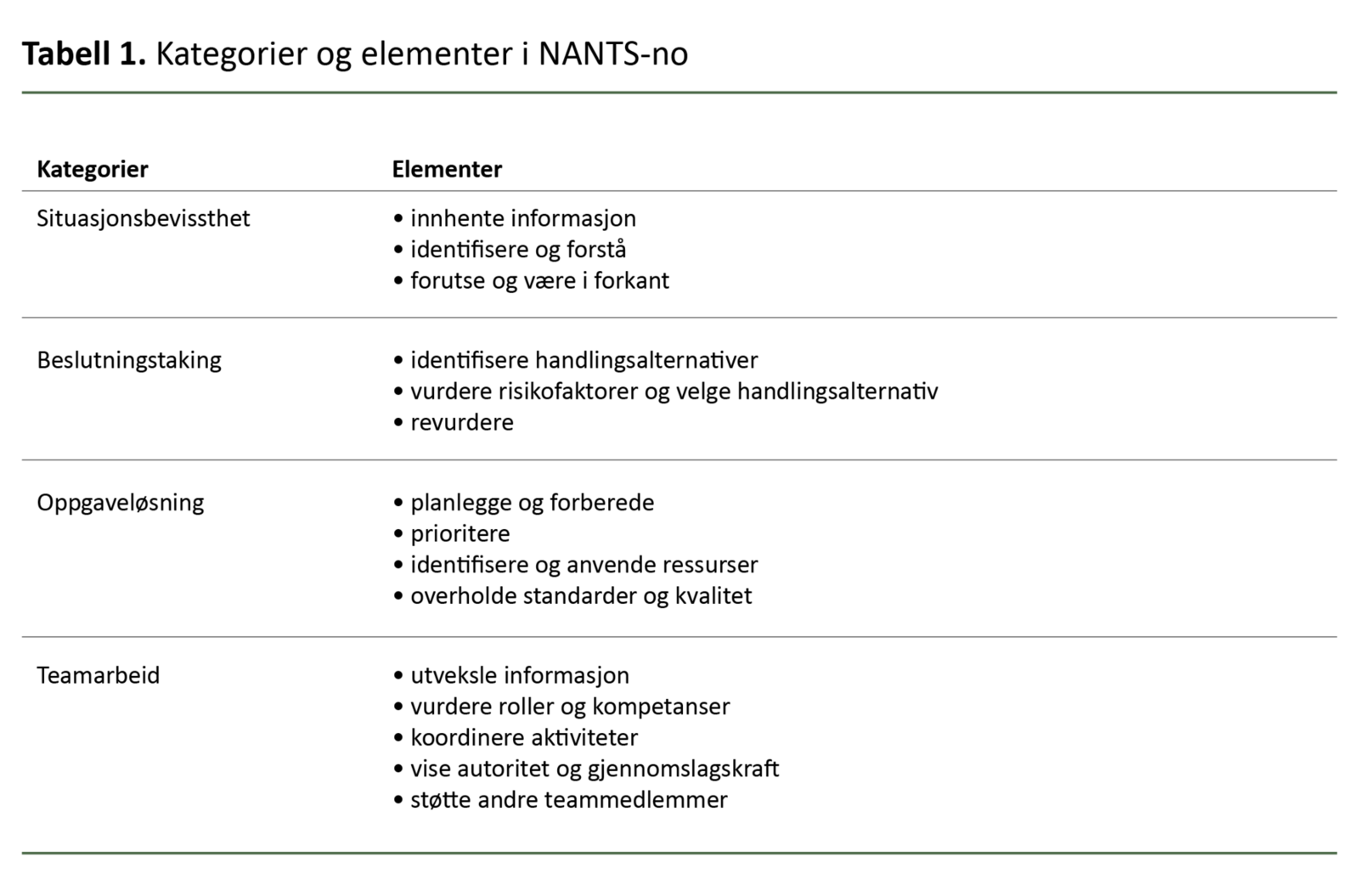 Hensikten med NANTS-no er å etablere et felles rammeverk for ikke-tekniske ferdigheter for utdanningsinstitusjoner og helseforetak. Verktøyet bygger på en tilpasning av Anaesthetists’ Non-Technical Skills (ANTS), som ble utviklet for anestesileger i Storbritannia (15).