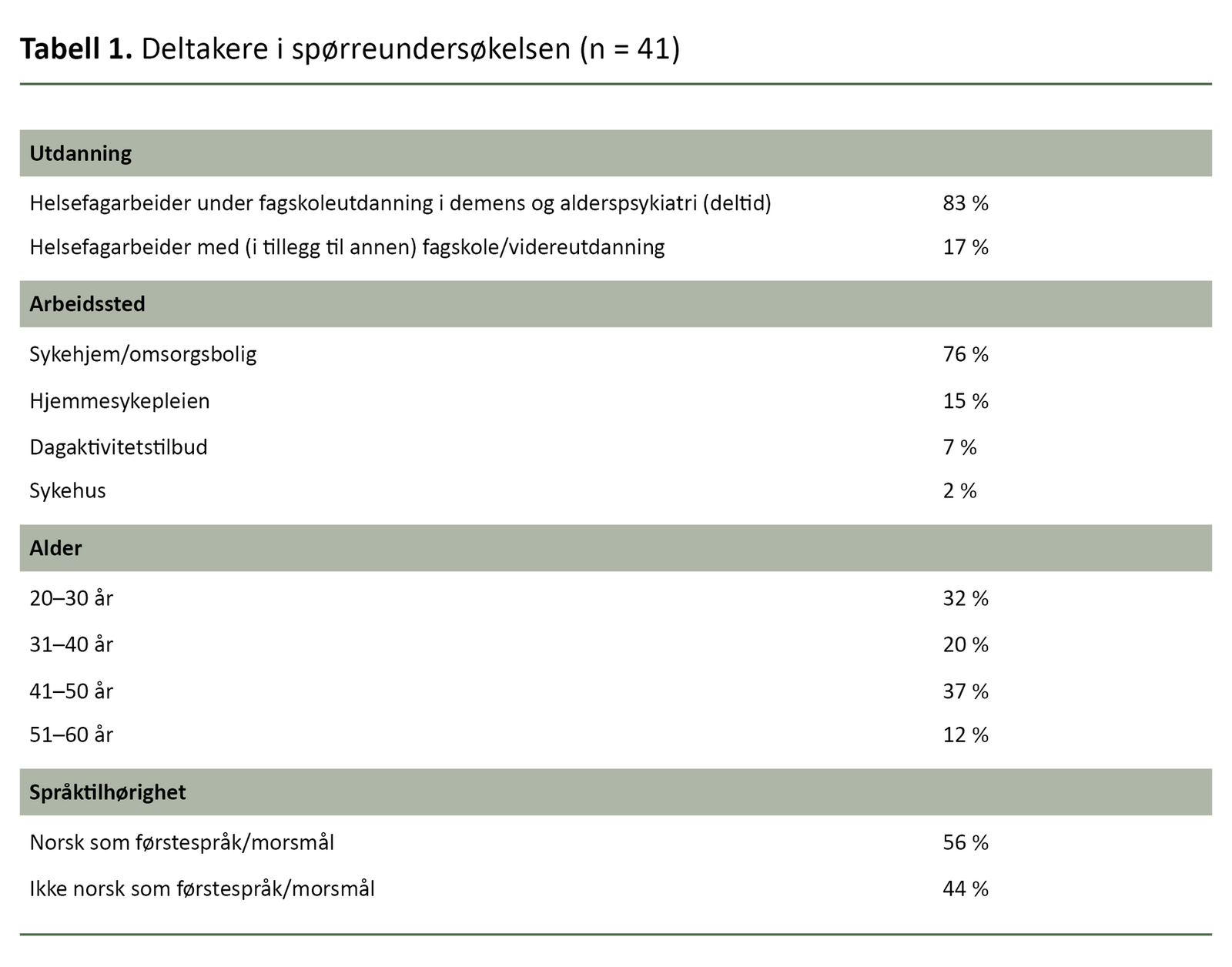 Deltakerne ble rekruttert gjennom fagskoleutdanningen i demens og alderspsykiatri hos Aldring og helse (se faktaboks under). Med unntak av én person arbeidet alle med eldre i den kommunale helse- og omsorgstjenesten spredt rundt i landet (se tabell 1).