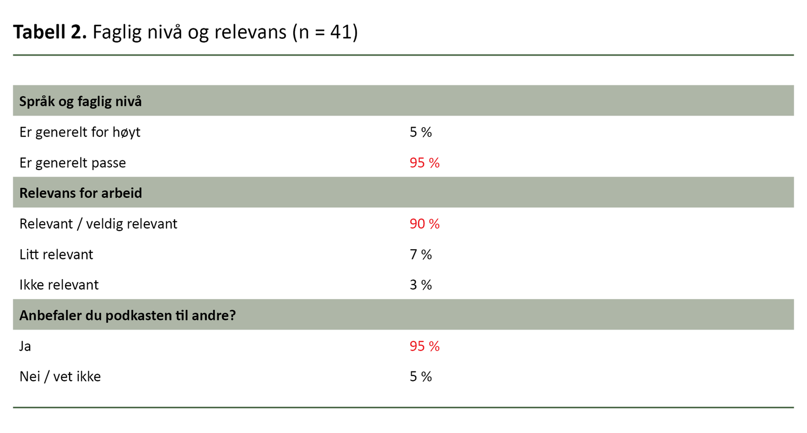 Respondentene svarte på spørsmål knyttet til podkastens faglige nivå, relevans og innhold samt hva de syntes om podkast som formidlingskanal for fagstoff. Resultatene er vist i tabell 2 og 3. Der 90 prosent eller flere av respondentene har gitt sin tilslutning til et utsagn, er tallene markert med rødt.