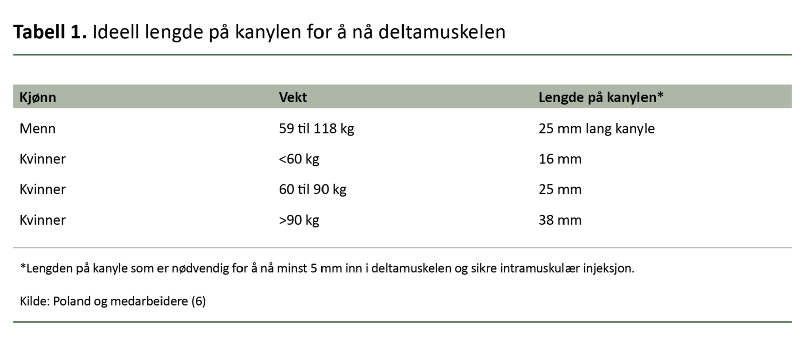I de nevnte studiene (6, 7) ble ikke huden strukket eller deltamuskelen sammenklemt, og de er basert på en 90 graders vinkel mellom overarmen og kanylen. Disse to studiene gir en god veiledning i hvor lang kanyle i forhold til vektgruppe som er hensiktsmessig for å nå 5 mm inn i deltamuskelen uten å treffe beinstrukturen.