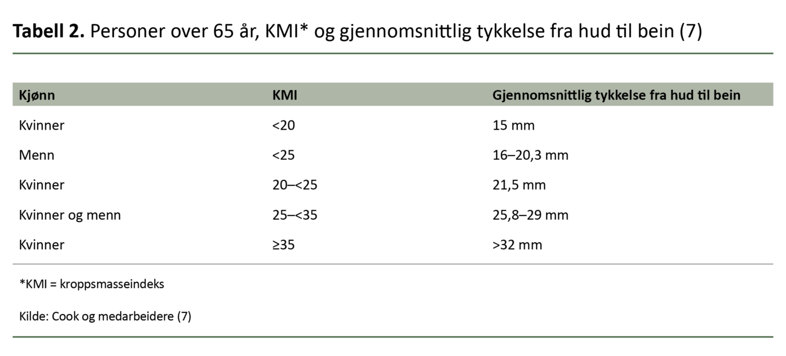 Studien til Cook og medarbeidere (7) viste dessuten at kvinner med KMI <20 hadde en gjennomsnittlig avstand mellom huden og beinet på 15 mm. Dermed vil en 16 mm lang kanyle sannsynligvis treffe beinstrukturen. For menn med KMI <25 og kvinner med KMI fra 20 opp til 25 er en 16 mm kanylelengde tilstrekkelig.