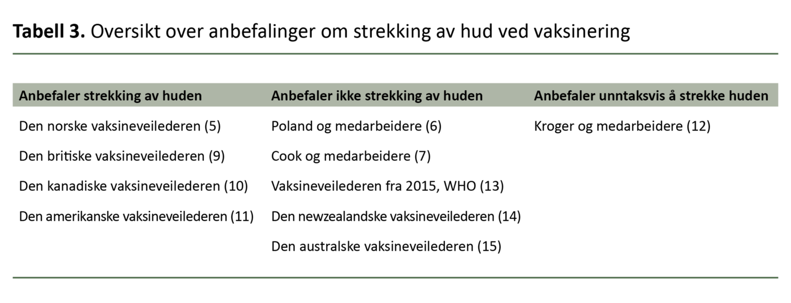 Det anbefales heller ikke å strekke huden i vaksineveilederne til New Zealand (14) eller Australia (15) (tabell 3). I disse forskjellige veilederne er det mangelfull henvisning til forskning på strekking av hud, slik at det er vanskelig å undersøke evidensen for anbefalingen.