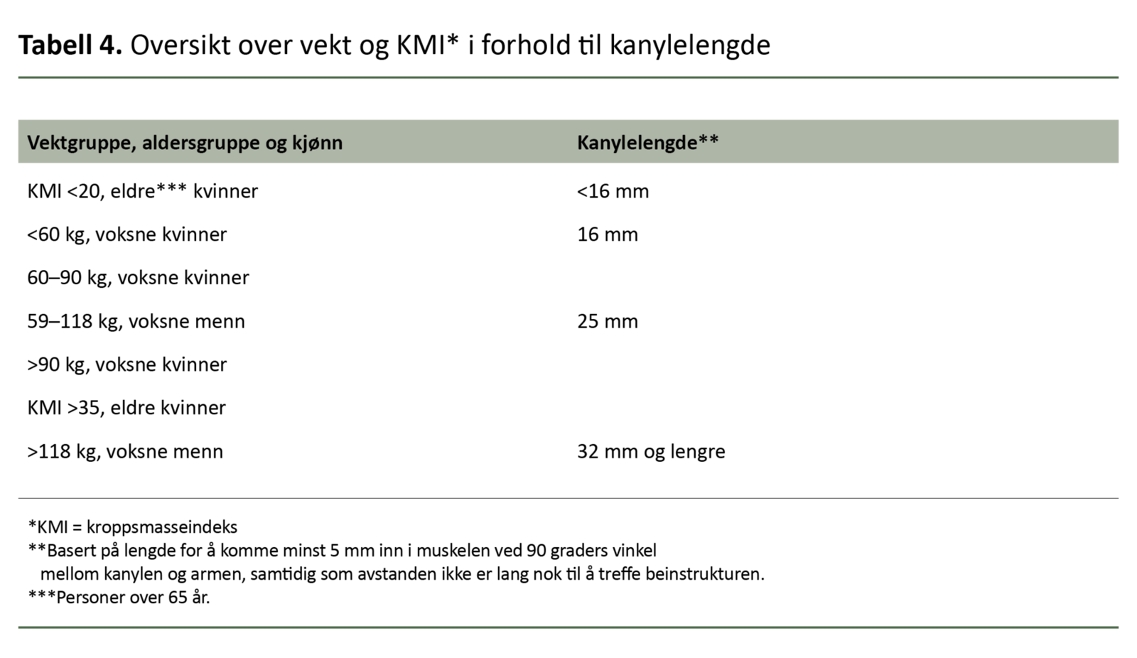 - Tabell 4 gjengir funn fra studier som kan være til hjelp for å velge kanylelengde til ulike vektgrupper og kjønn (6, 7), men disse funnene erstatter ikke individuell vurdering. Det kan være en betydelig variasjon i vektgruppene, spesielt blant eldre.