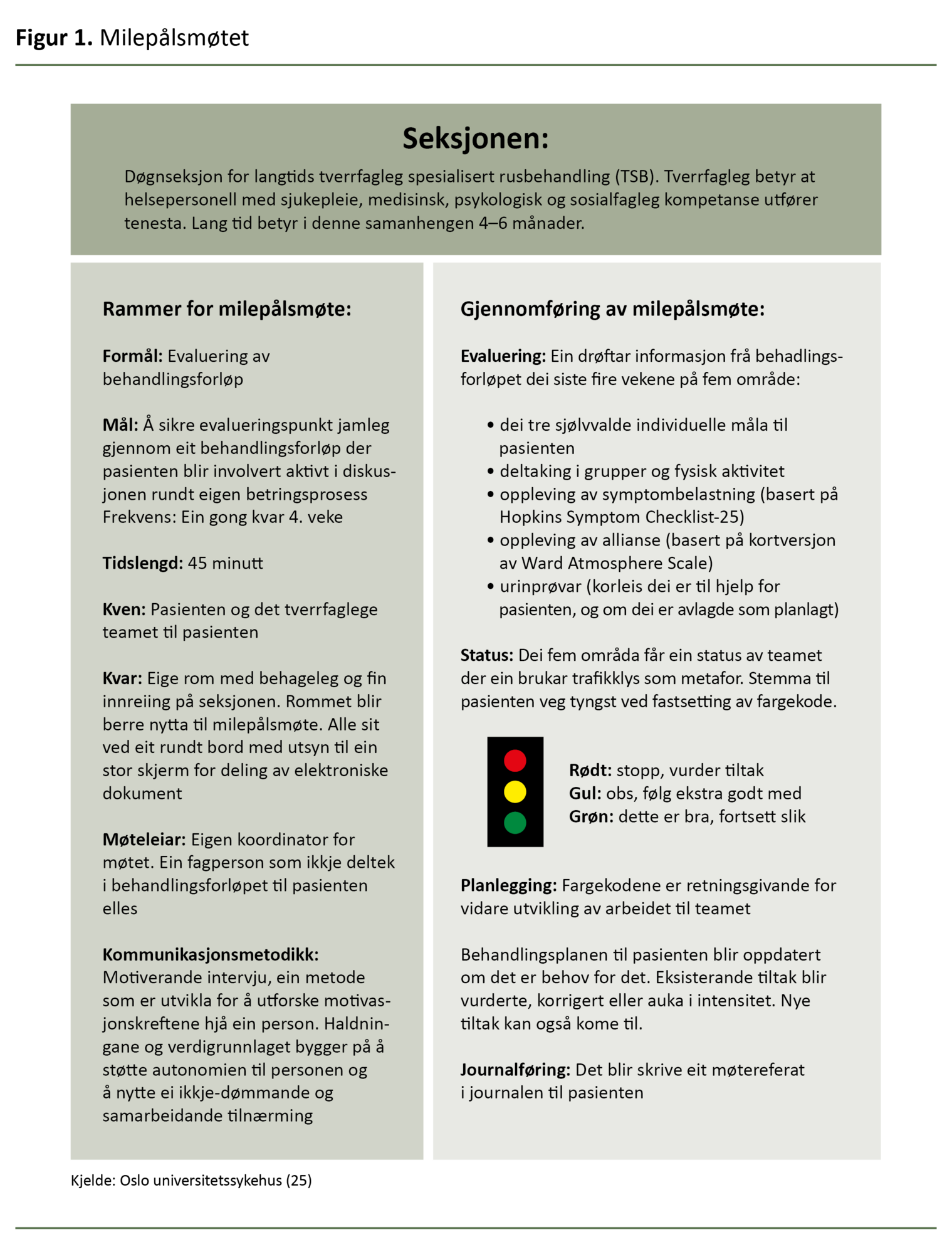 Ulike element i milepålsmøta som bruk av fargekodar, grøn, gul og raud (sjå figur 1), at tidspunkt for møtet kom i god tid, jamleg utfylling av spørjeskjema (måling av symptomtrykk hjå pasient og relasjonen mellom terapeut og pasient) og bruk av ekstern koordinator var gjentakande tema hjå informantane.