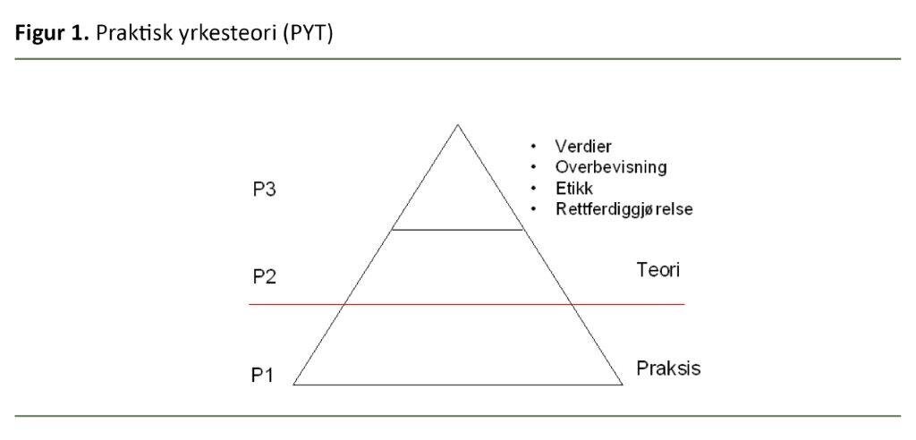 Den nyutdannede sykepleieren utfordres til kritisk å undersøke grunnlaget for sine egne handlinger (15) og dermed utvikle sin egen praktiske yrkesteori (PYT), se figur 1 (16, s. 25). PYT innebærer håndtering av situasjoner på P1-nivå, begrunnelser for handlingene på P2-nivå og etiske vurderinger på P3-nivå (16).