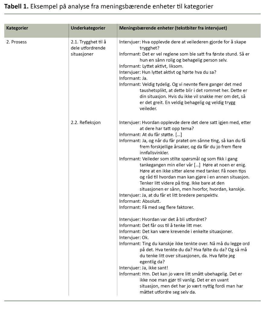 Vi analyserte de transkriberte intervjuene ved hjelp av systematisk tekstkondensering i fire trinn: å få et helhetsinntrykk, identifisere meningsbærende enheter, abstrahere innholdet i de enkelte meningsbærende enhetene i underkategorier og samle informasjonen under kategorier (19).