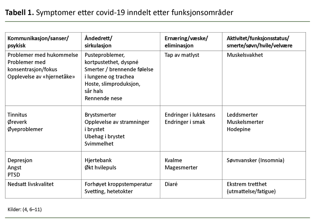 Vi har som sykepleiere erfart at pasientene som kommer til rehabilitering etter covid-19, sliter med et komplekst bilde av både fysiske, psykiske og kognitive symptomer. Tabell 1 viser de ulike symptomene som kan være vedvarende etter covid-19 (4, 6–11).