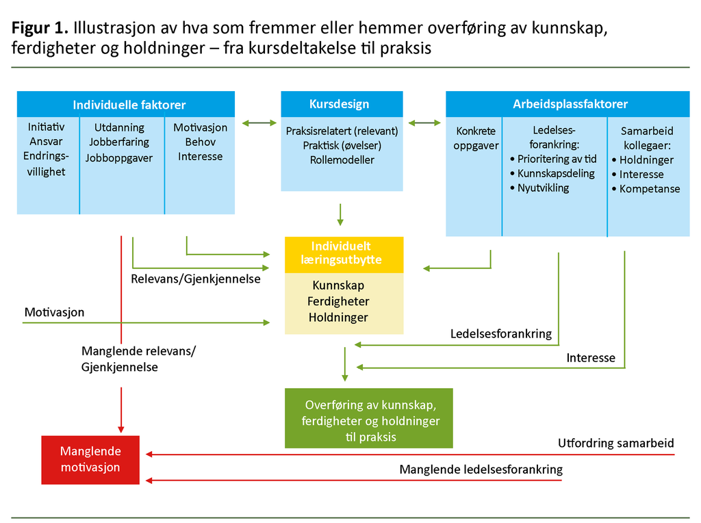 Det er flere faktorer som har betydning for om det er mulig å praktisere det man lærer på kurs. Det er en forutsetning at kursdeltakeren har fått et faktisk læringsutbytte. Det er imidlertid ikke tilstrekkelig med individuelt læringsutbytte. Muligheten for og motivasjonen til å praktisere det man har lært på et kurs, er også påvirket av blant annet ledelsesforankring, omfang og kvalitet på samarbeidet med kollegaer samt den enkelte kursdeltakerens egen ansvarsfølelse og initiativ.