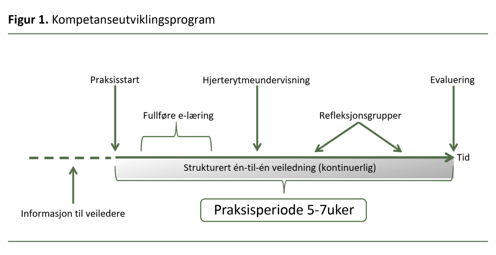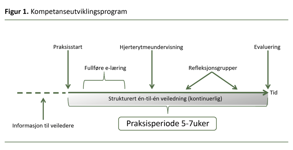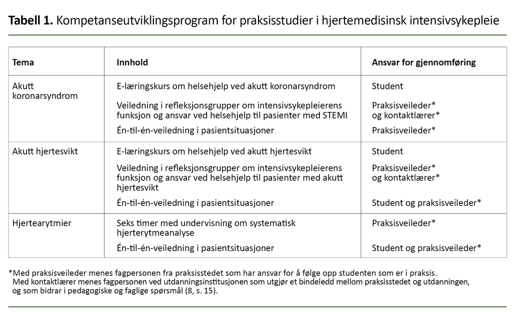 Prosjektet var et kvalitetsforbedringsarbeid og gikk ut på å utvikle og implementere et kompetanseutviklingsprogram for praksisstudier i hjertemedisinsk intensivsykepleie, som er beskrevet i tabell 1 og figur 1.