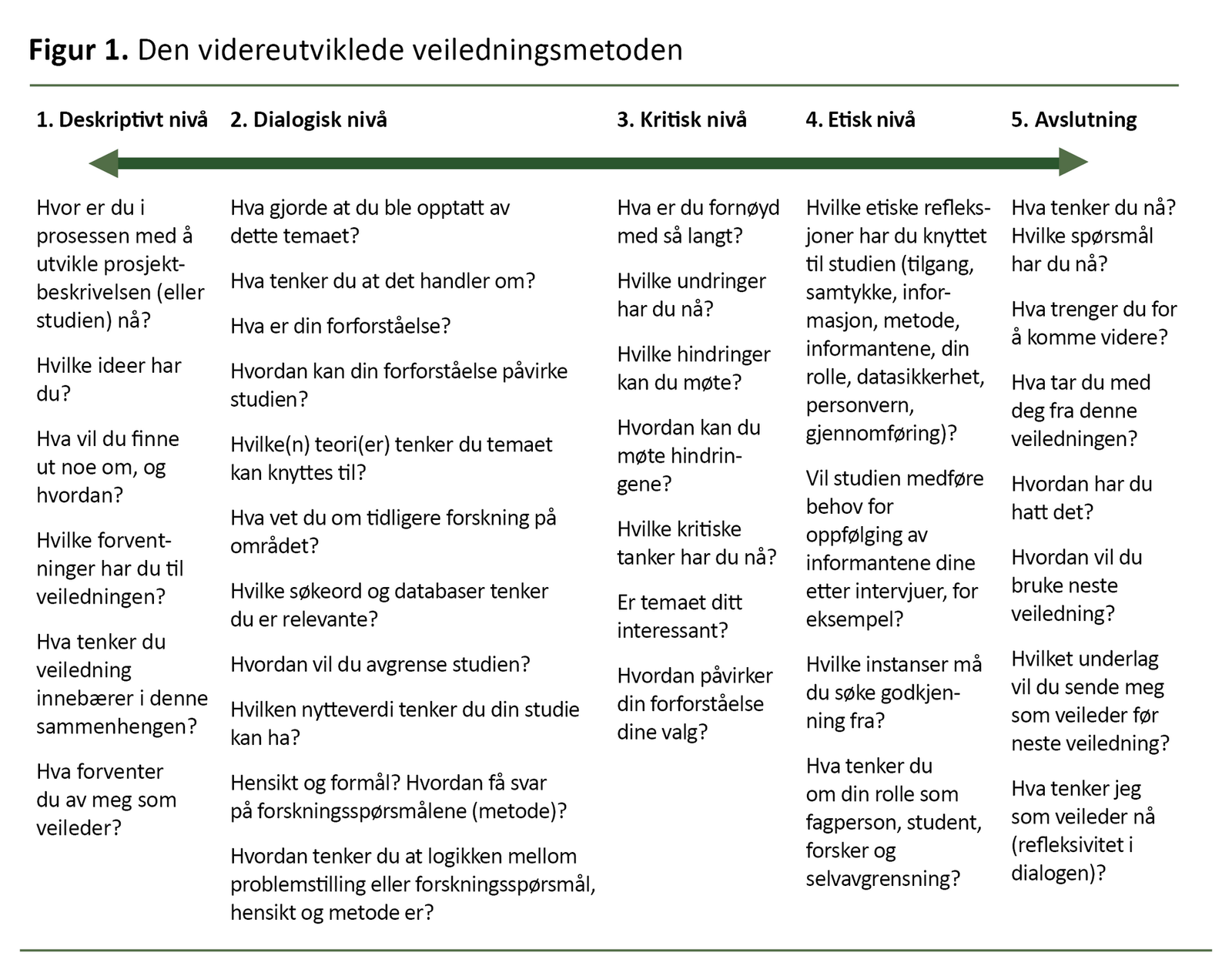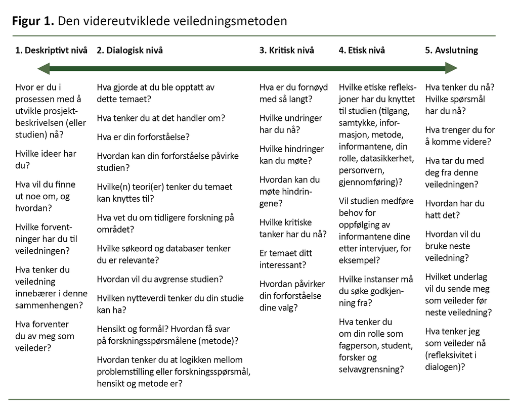 Tveitens (3) veiledningsmetode er utformet i et deskriptivt, dialogisk, kritisk og etisk refleksjonsnivå. I vår videreutviklede metode er spørsmålene utformet med utgangspunkt i disse nivåene samt læringsutbyttene tilknyttet utvikling av en prosjektbeskrivelse til masteroppgaven.