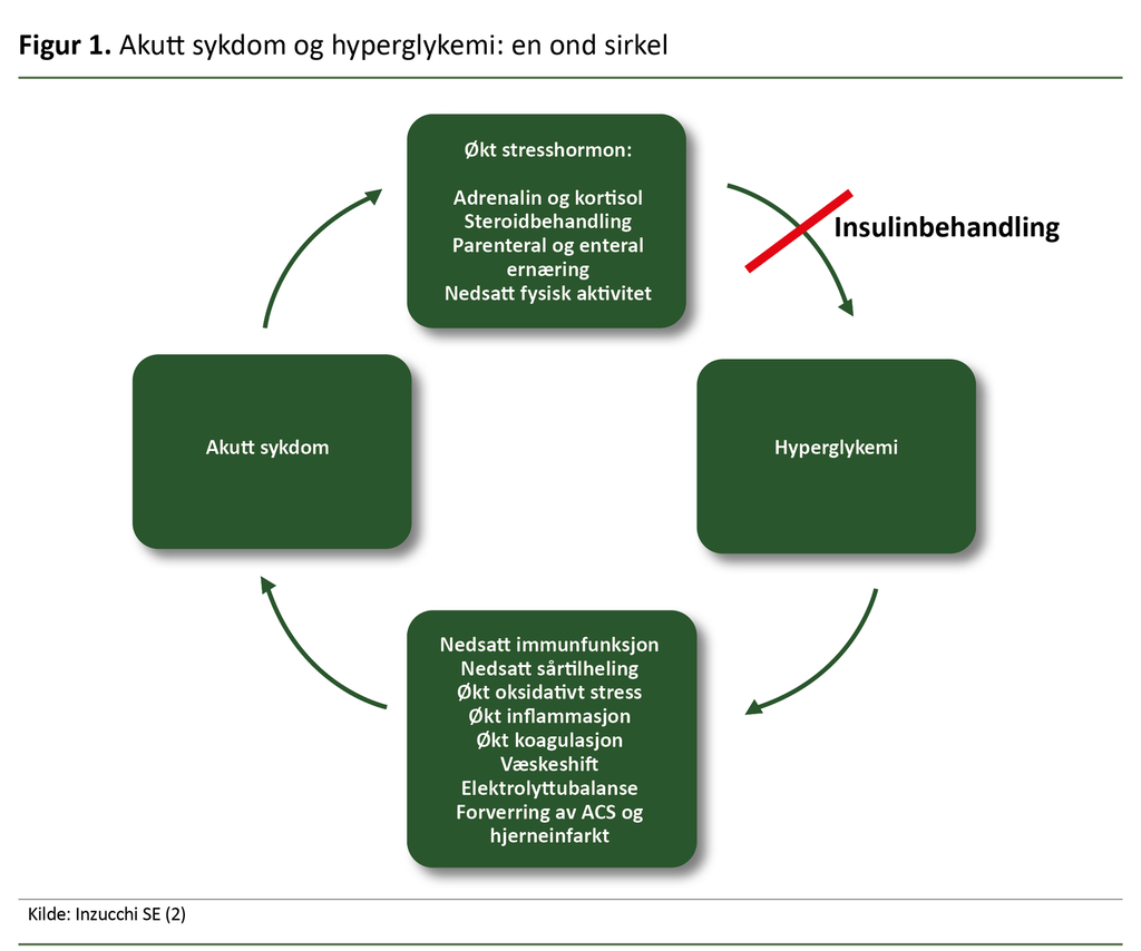 Hyperglykemi kan i seg selv gi nedsatt sårtilheling, dårligere immunfunksjon, elektrolytt ubalanse og væskeskift. Dette kan forverre den akutte sykdommen. Slik kan pasienten komme i en ond sirkel, som må brytes med insulinbehandling som reduserer hyperglykemien (figur 1).