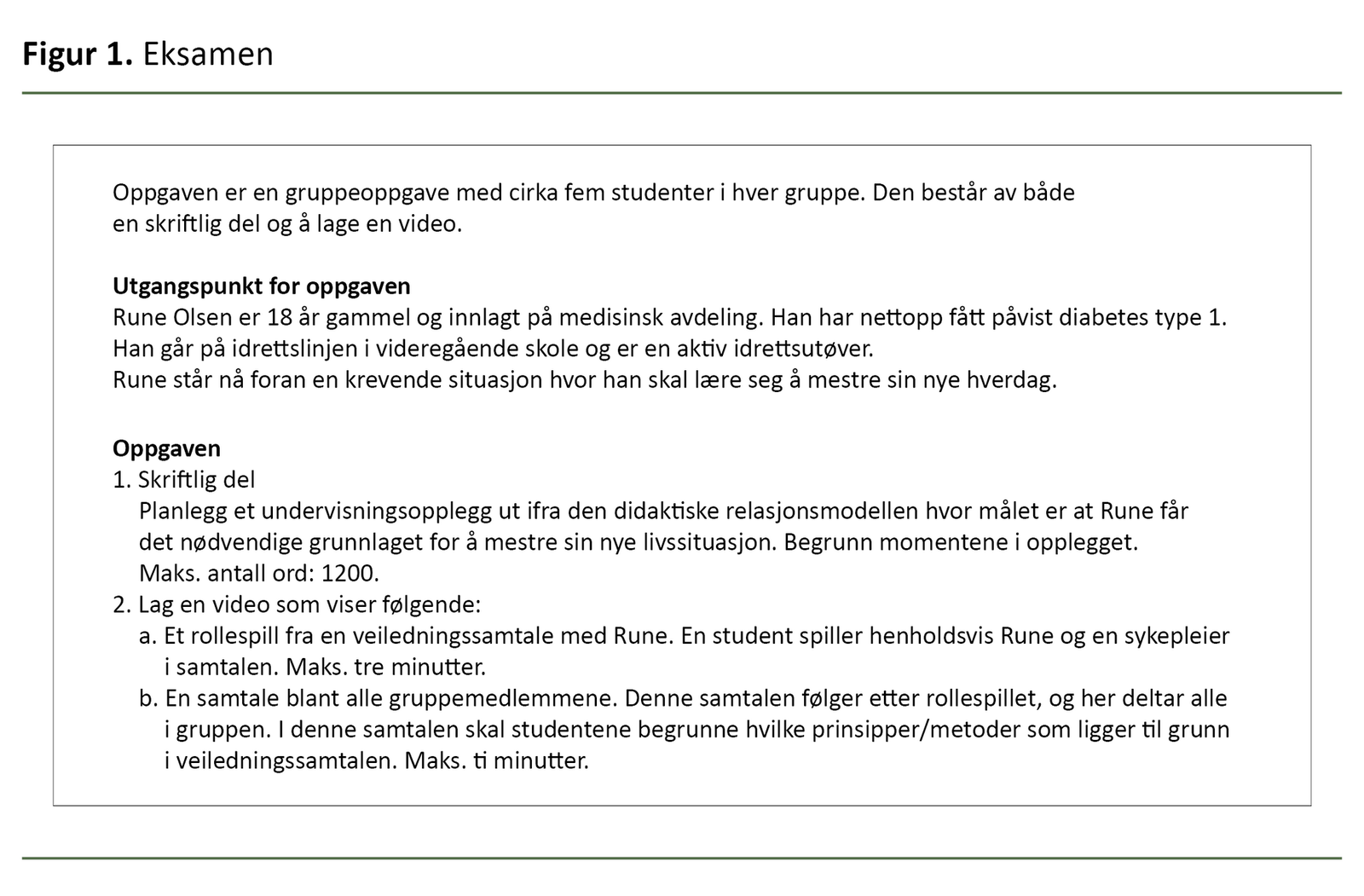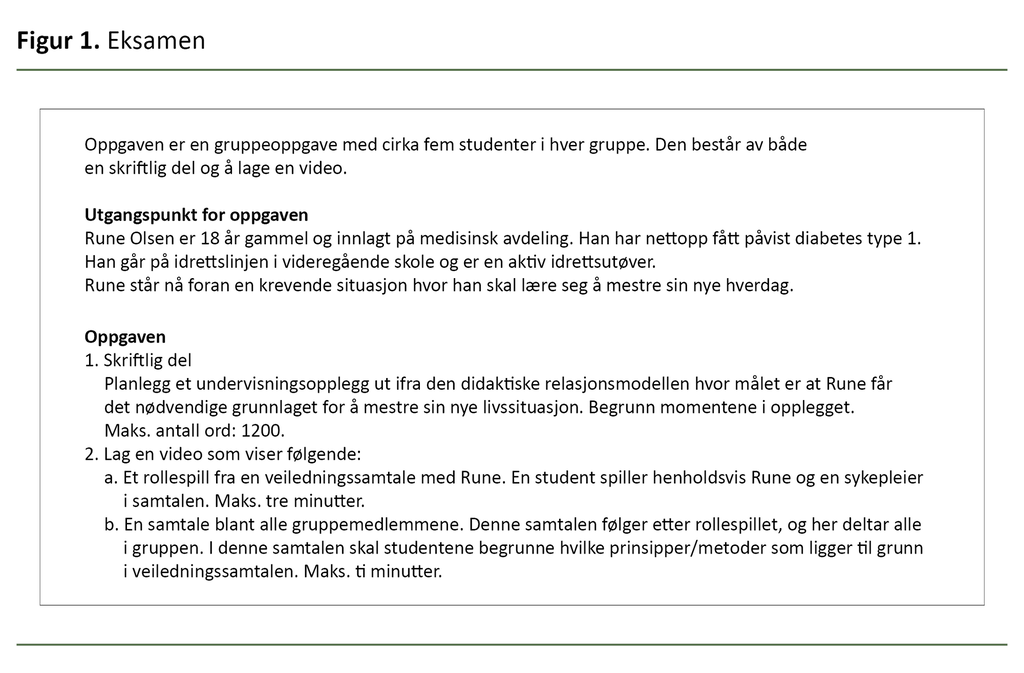 Eksamensoppgaven (figur 1) inneholdt alle de aktuelle læringsutbyttene og ble lagt ut i Canvas ved oppstarten av emnet. Sensuren viste store forskjeller. Flere grupper fikk tydelig vist at de hadde forstått de aktuelle metodene, både i rollespillet og samtalen etterpå.