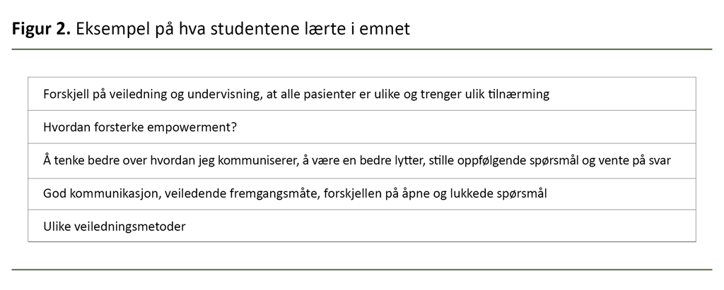 Videoen til gruppen som hadde best mestring, ble vist i plenum for å gi studentene mulighet til å speile sitt eget bidrag. For å bevisstgjøre studentene på deres egen læring ba vi dem om å skrive ned tre ting de hadde lært om den pedagogiske og veiledende funksjonen (figur 2).