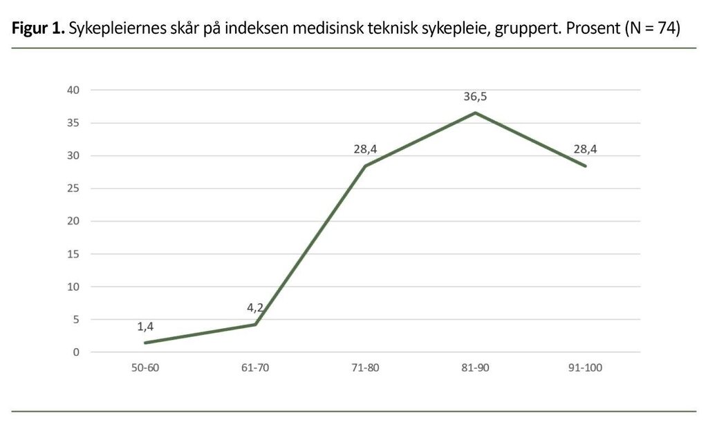 Figur 1 viser andelen sykepleiere etter deres skår på indeksen medisinsk teknisk sykepleie, og 64,9 prosent av sykepleierne hadde en skår på mellom 81 og 100. Gjennomsnittsskåren og medianverdien var 83.