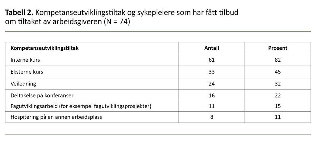 Tabell 2 viser kompetanseutviklingstiltakene som arbeidsgiveren benyttet seg av, og hvor mange av sykepleierne som fikk tilbud om tiltakene.