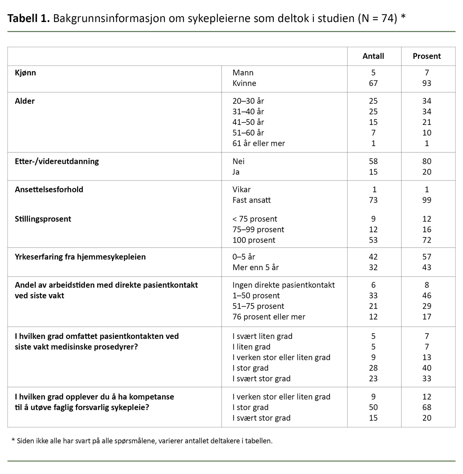 De fleste sykepleierne som deltok i studien, var kvinner (se tabell 1). De fleste var mellom 20 og 40 år, fast ansatt i hjemmesykepleien og hadde 100 prosent stilling.