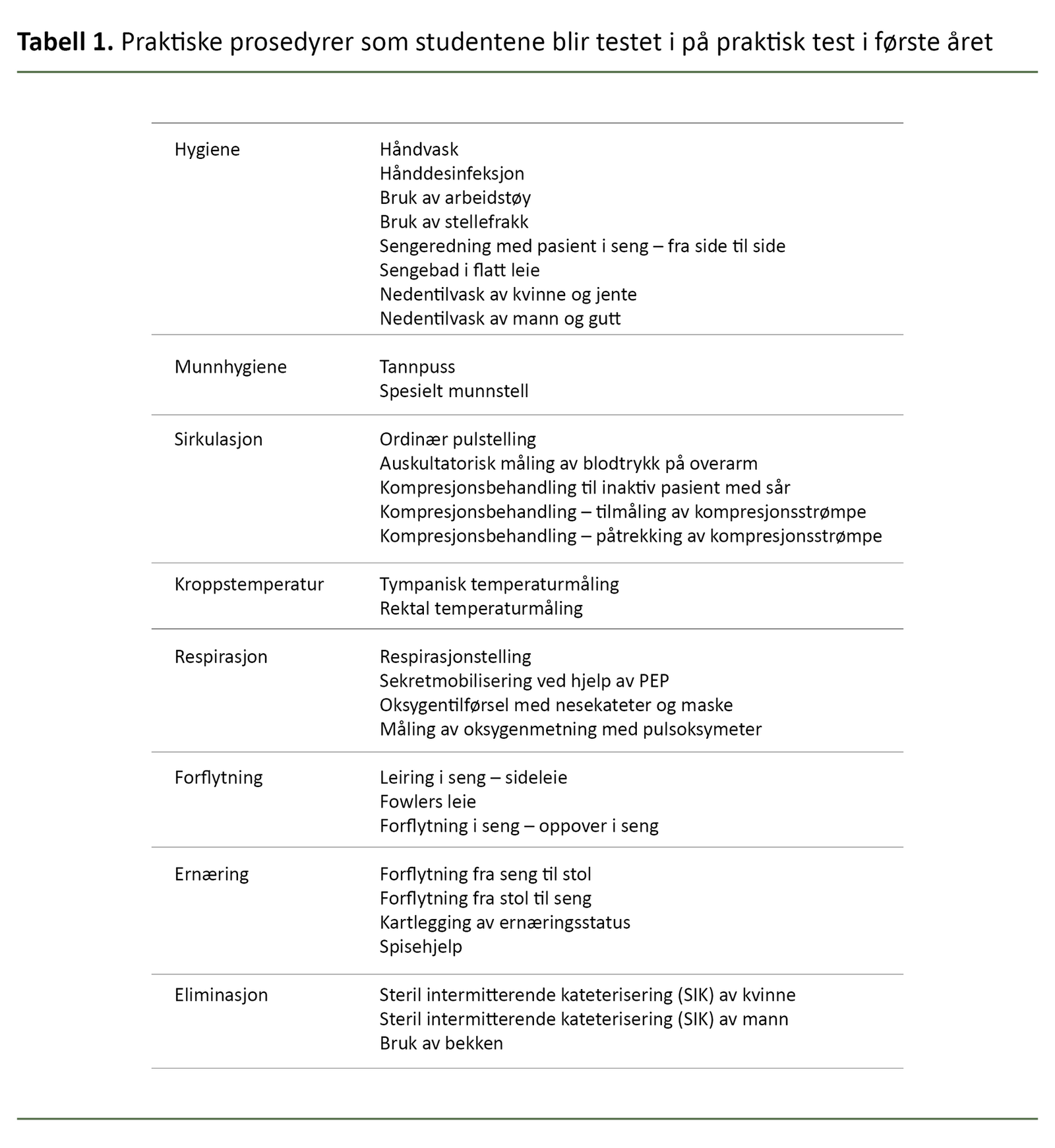 Tidligere var denne testen en del av eksamen i emnet «Grunnleggende sykepleie og sykepleie til eldre» og ble gjennomført etter praksisperioden. Testen er individuell, vurderes til «bestått» eller «ikke bestått» og tar utgangspunkt i prosedyrer studentene har øvd på under ferdighetstrening i et øvingssenter (tabell 1).