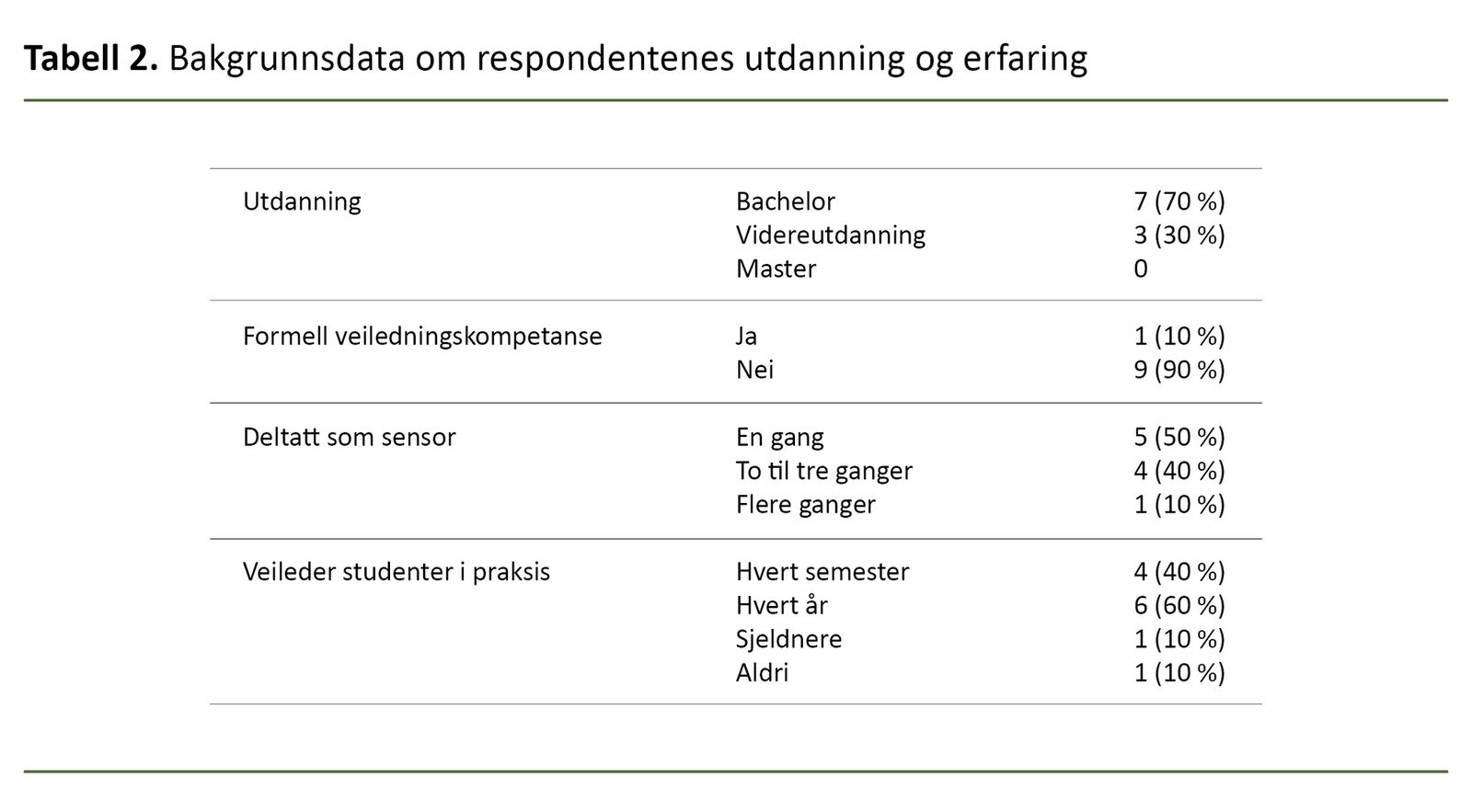 Gjennomsnittlig alder på respondentene var 46 år. Alle var kvinner, og de hadde jobbet fra 3,5 til 39 år i yrket (gjennomsnittlig 14 år). Tre av de ti hadde videreutdanning i geriatri, akuttsykepleie og lindrende behandling. Bare to av ti veiledet studenter i praksis sjeldnere enn én gang i året (tabell 2).