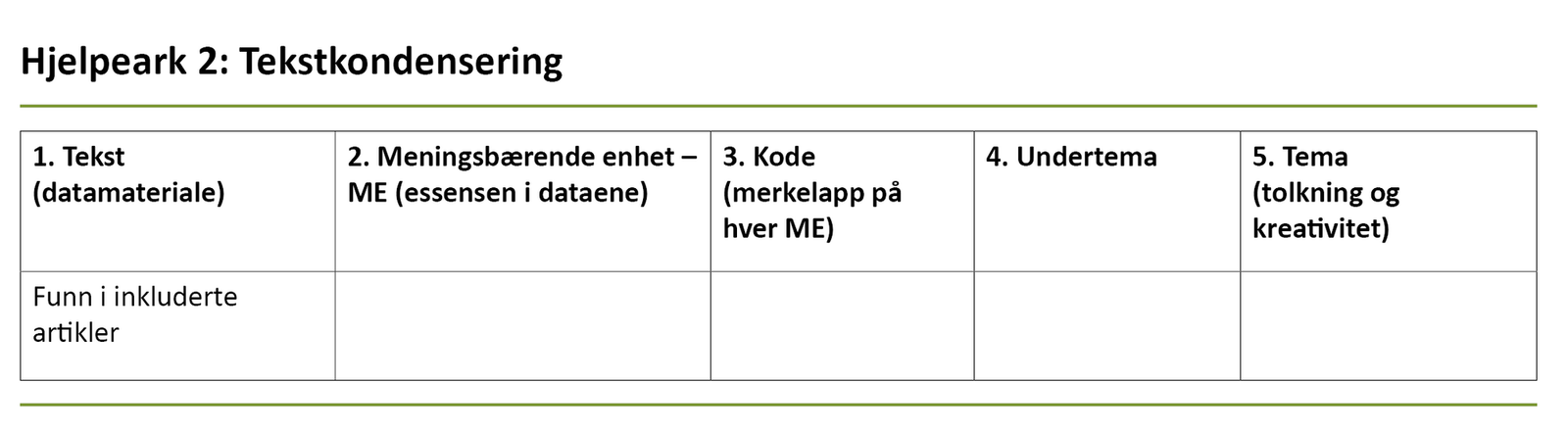 Hjelpearkene er utformet som en tabell med kolonner som tilsvarer stegene i analyseprosessen. På den måten kan studentene få hjelp til å følge de enkelte stegene og samtidig skape en oversikt over utvikling og resultater i egen analyseprosess.