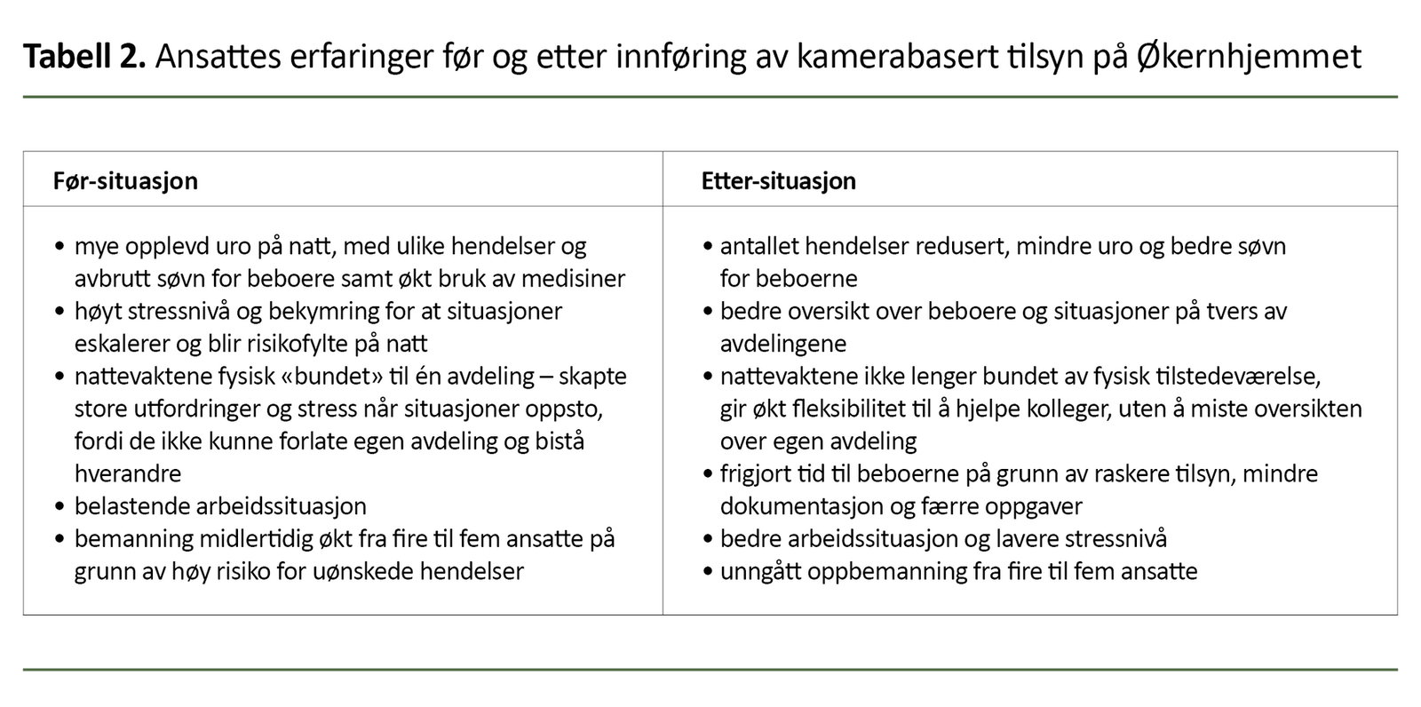 Økernhjemmet unngikk med digitale tilsyn å øke bemanningen fra fire til fem stillinger på natt (jf. tabell 2 over) – med andre ord en unngått kostnad tilsvarende 25 prosent av lønnskostnadene på natt.