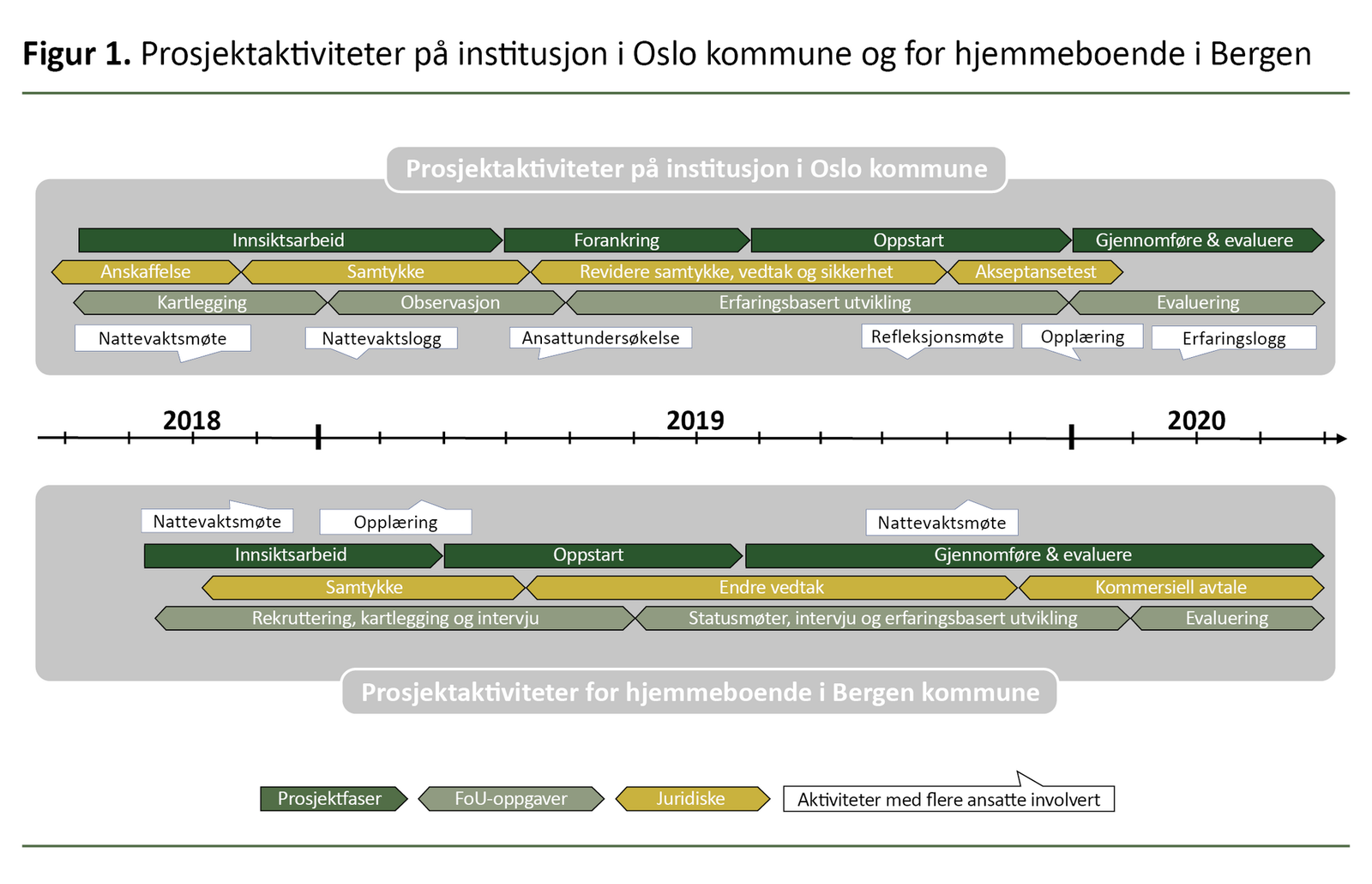 Brukere, pårørende og ansatte ved begge utprøvingsstedene ble informert om prosjektet og hva kamerabasert tilsyn ville innebære for dem som deltakere. I Bergen kommune ble det innhentet skriftlig informert samtykke fra alle brukere og pårørende som deltok. På Økernhjemmet ble det innhentet samtykke fra pårørende eller verge for brukerne. Figur 1 under gir en tidslinje for aktivitetene i prosjektet.