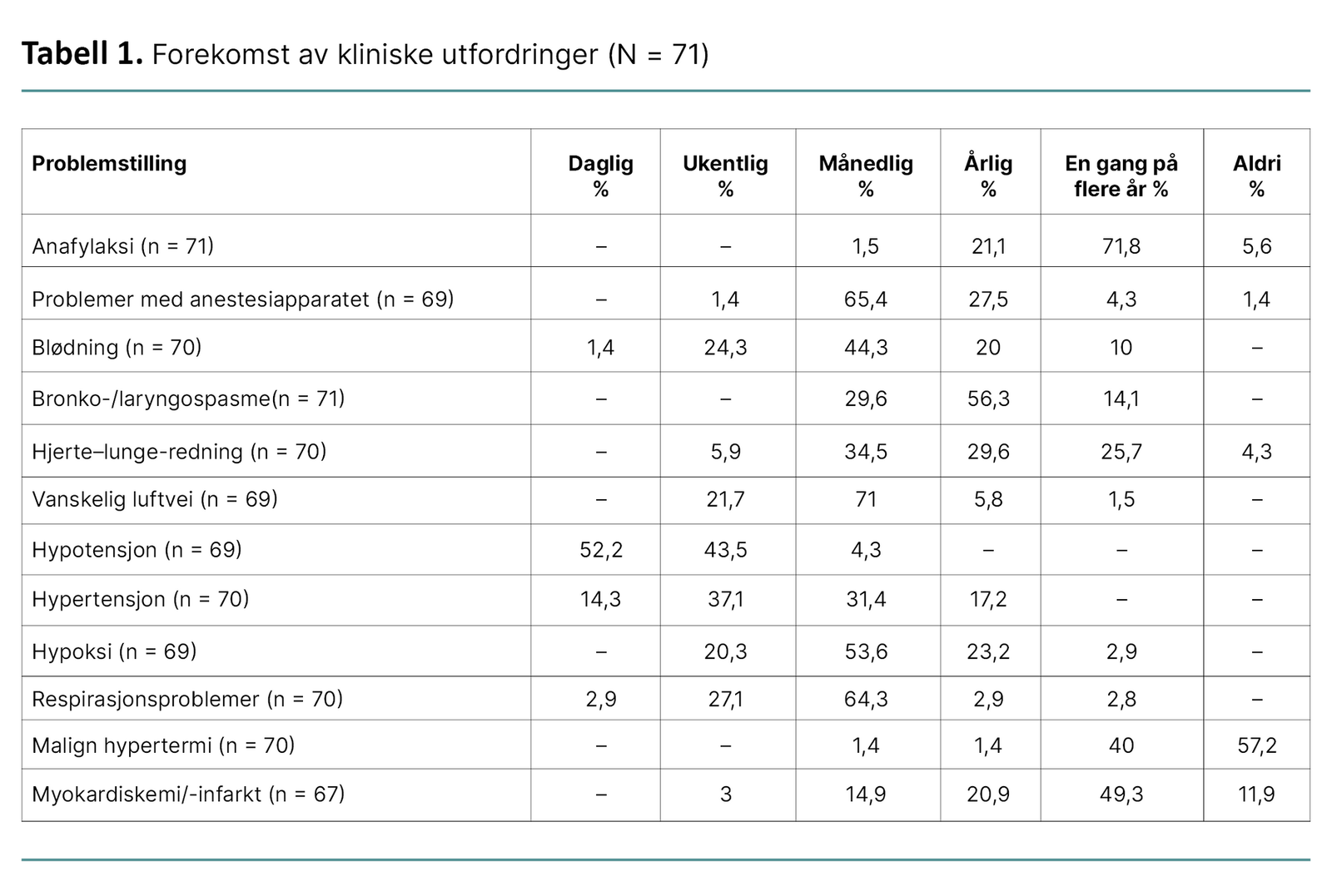 Tabell 1 viser hva anestesisykepleierne oppga som sine kliniske utfordringer i arbeidshverdagen.
