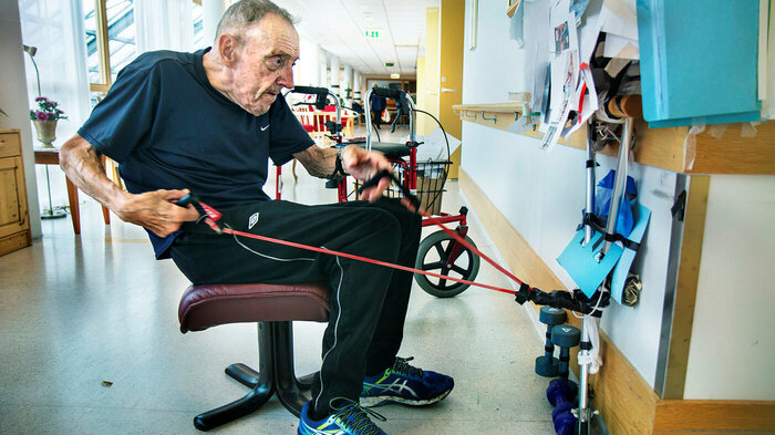 På sykehjemmet har Erik Amundsen laget sin egen romaskin. Han har troen på at mosjon og musikk kan hjelpe parkinsonsyke.