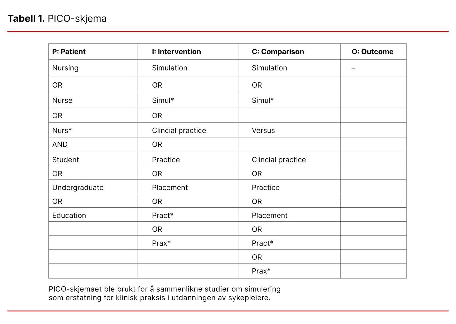For å belyse tematikken tok jeg utgangspunkt i et PICO-skjema (se tabell 1).