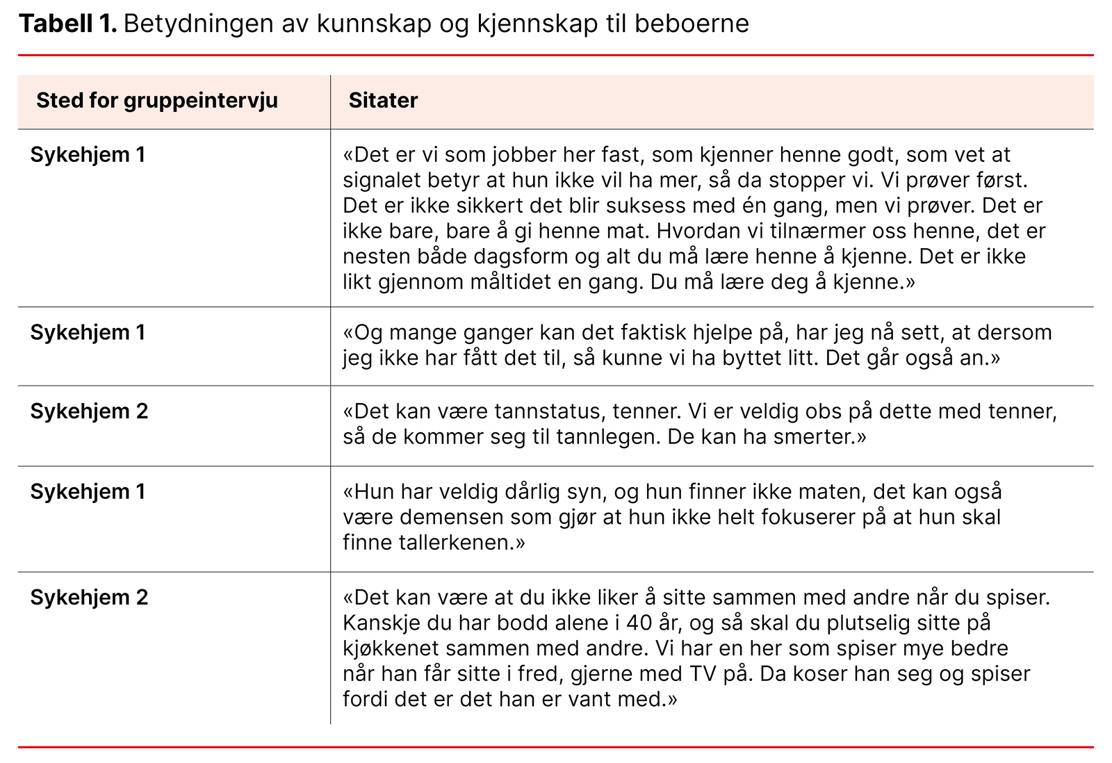Og det som pleierne i utgangspunktet tenker vil være bra, kan vise seg ikke å stemme. Individuell tilpasning er viktig og krever kunnskap og kjennskap til hver enkelt beboer, som sitatene i tabell 1 viser. Kunnskap og kjennskap til beboerne er også sentrale funn i annen forskning (9, 11−13): «Du må kjenne folkene dine» (13, s 252). God praksis i måltidet avhenger av tilstrekkelig kompetanse hos personalet og er nødvendig for at hjelpen som ytes, skal være faglig forsvarlig (15−17).