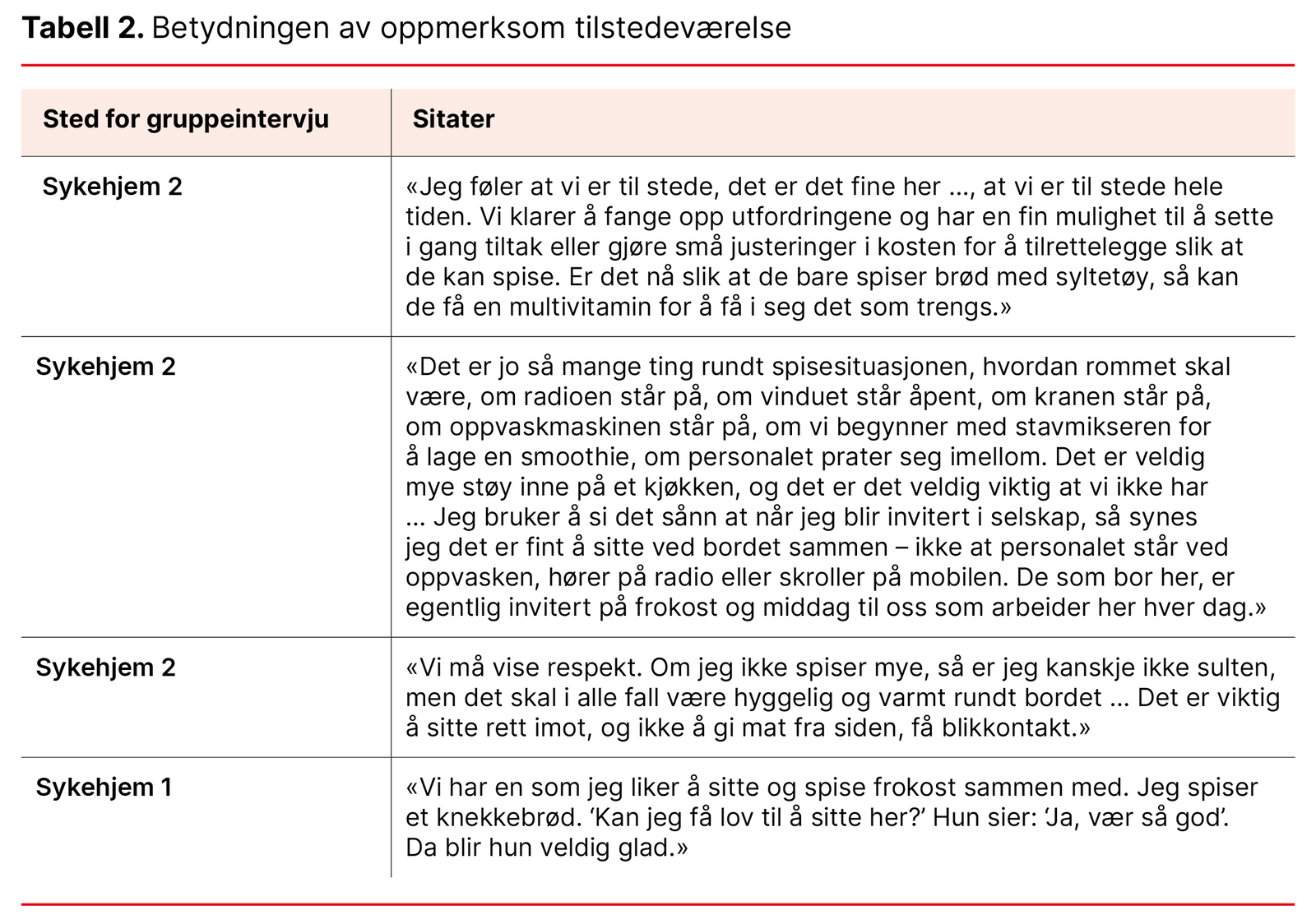 Det kan likevel være situasjoner der beboere som har behov for å bli sett og ivaretatt, kan bli oversett, og dermed ikke spiser tilstrekkelig. Eksempel på en slik situasjon kan vi se i feltnotatet under, der en beboer som tilsynelatende virker mer selvhjulpen enn de andre, blir overlatt til seg selv. Tabell 2 viser sitater som handler om betydningen av oppmerksom tilstedeværelse.