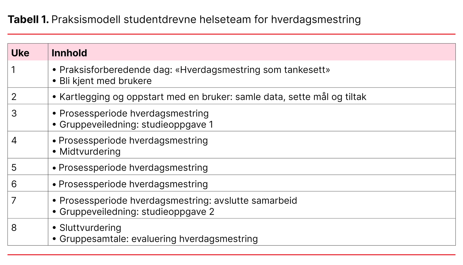 Praksismodellen (se tabell 1) er organisert som en strukturert prosess over åtte uker der studentene anvender teoretisk kunnskap i praksis, samtidig som de støtter eldre brukere i deres daglige liv.