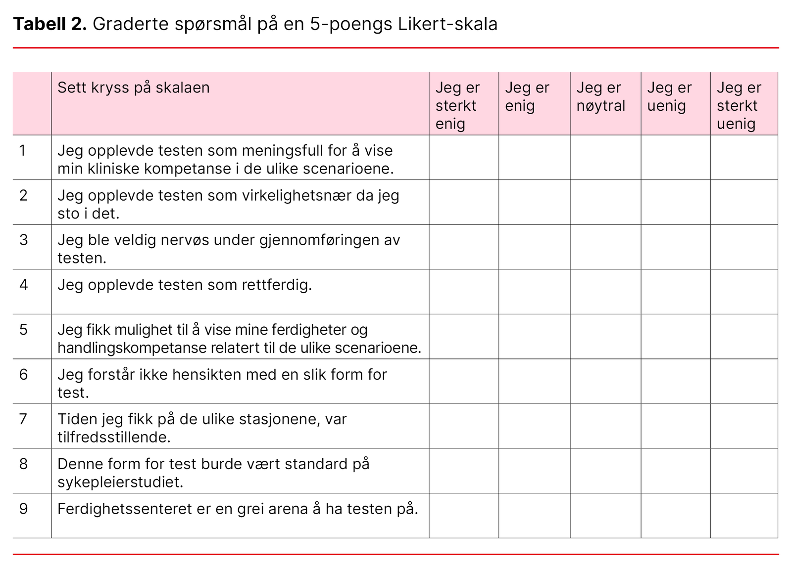 Hensikten med spørsmålene var at studentene skulle reflektere over selve testen, prosessen og deres erfaringer med å gjennomføre en OSKE-test. Likert-skalaen hadde fem svaralternativer, fra «sterkt enig» til «sterkt uenig».