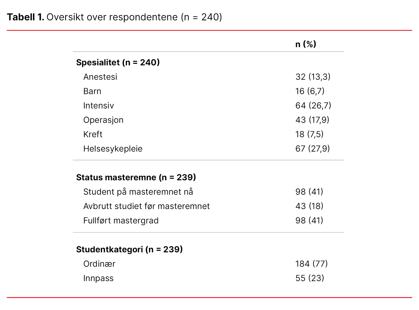 Tabell 1 viser at det kom inn svar fra alle spesialiseringene, med flest svar fra intensiv- og helsesykepleie. Omtrent to av fem var studenter i masteremnet da de svarte, to av fem hadde fullført mastergraden og én av fem hadde avbrutt studiet.