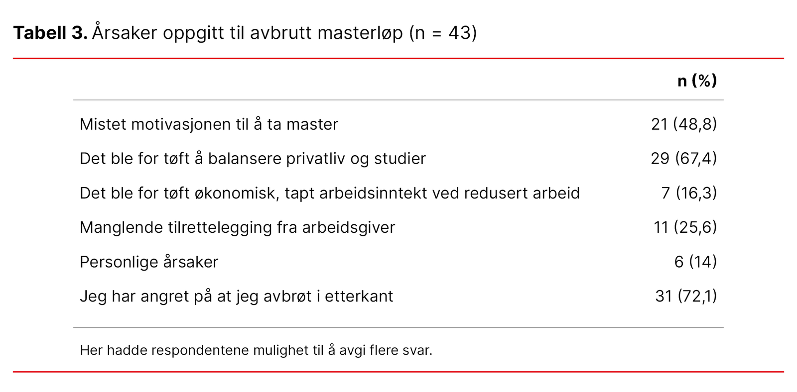 Tabell 3 viser at omtrent halvparten av de 43 som hadde avbrutt masterløpet, oppga at de mistet motivasjonen for å fullføre. Omtrent to av tre (67,4 prosent) sa at det ble for krevende å kombinere studier med privatlivet. Til sammen oppga 72,1 prosent at de i ettertid har angret på at de avbrøt mastergraden.